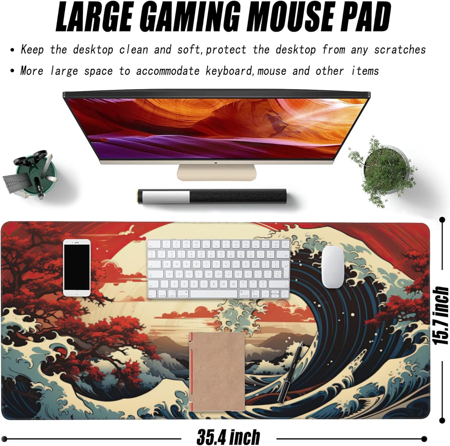 Extended Large Gaming Mouse Pad, Japanese Great Wave Sunset Large Desk Mat for Desktop, Non-Slip Rubber Base Stitched Edges Long Computer Keyboard Desk Pad Mouse Mat for Home Office 35.4"X15.7"