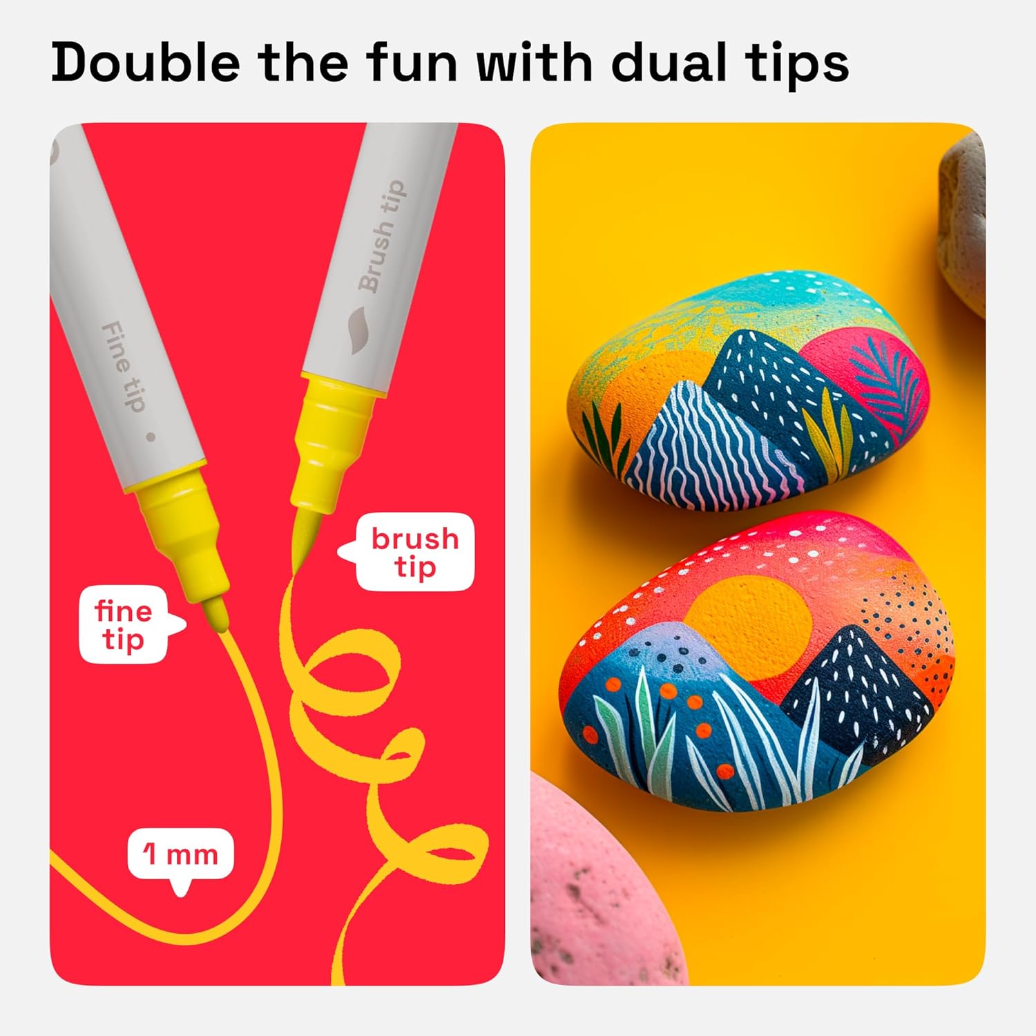 - DUAL TIP: Our fabric paint markers come with 2 tips for 2x the fun. The acrylic paint pens are equipped with a 1-5 mm brush tip and a 1mm fine tip. Get the most out of your acrylic markers with a vibrant palette of colors!