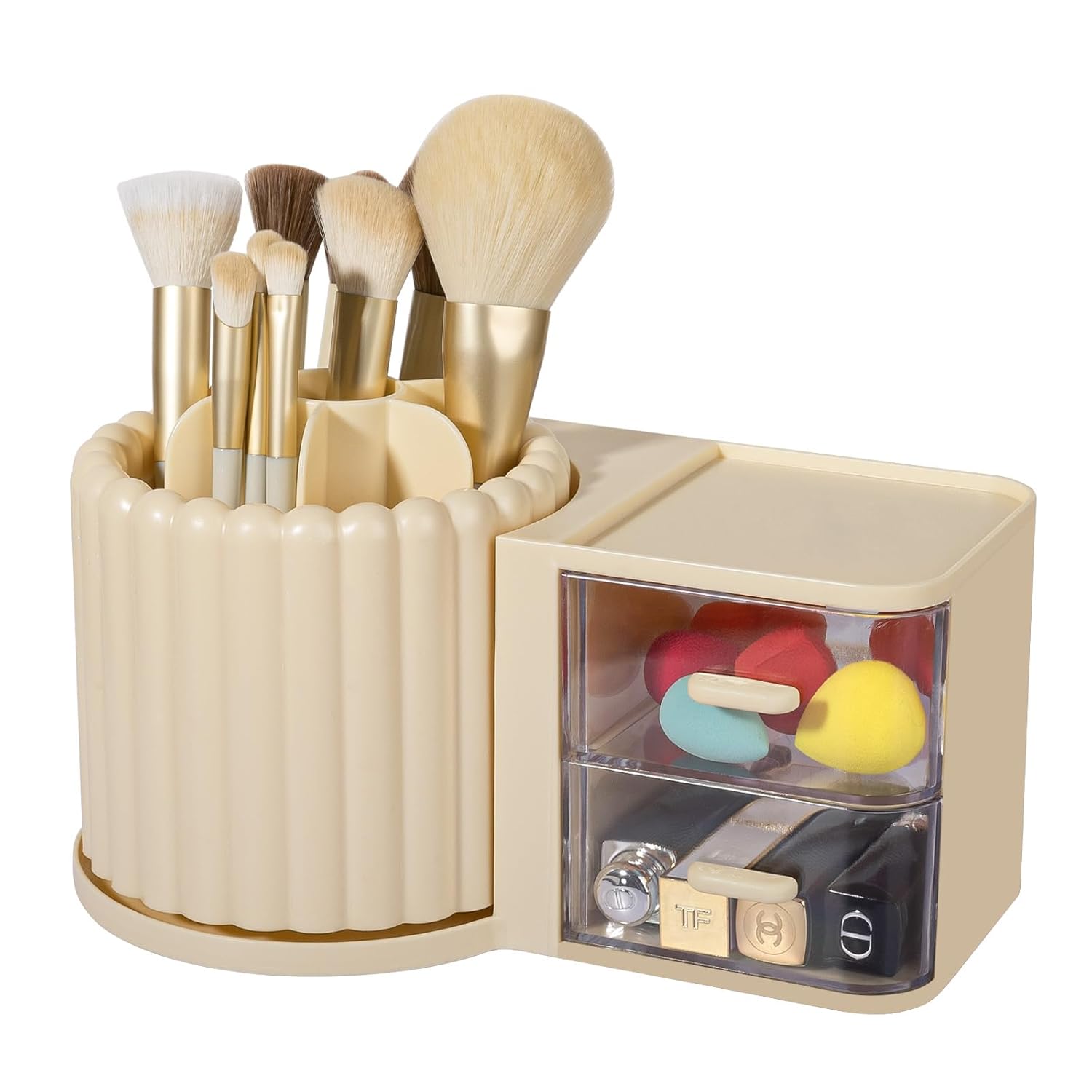 Anyoifax 360 Rotating Makeup Brush Holder 7 Slots Makeup Organizer with Drawer Removable Spinning Cosmetic Storage Pen Holder for Vanity, Dresser, Desk, Beige