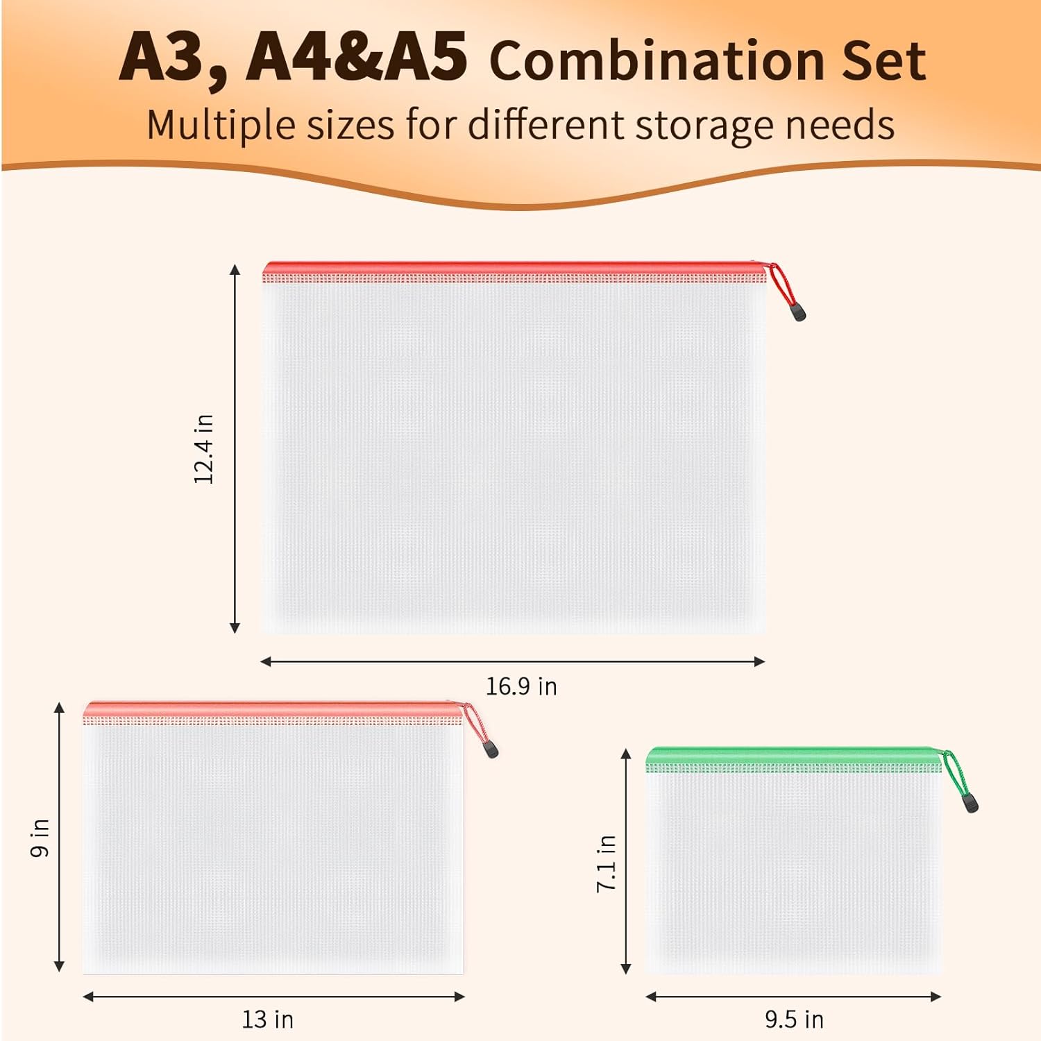 Umriox Mesh Zipper Pouch Bags, A3+A4+A5, (6 colors, 18 Packs), Clear Zipper Pouches, Waterproof Zipper Pouches for Office Supplies Cosmetics Travel Storage