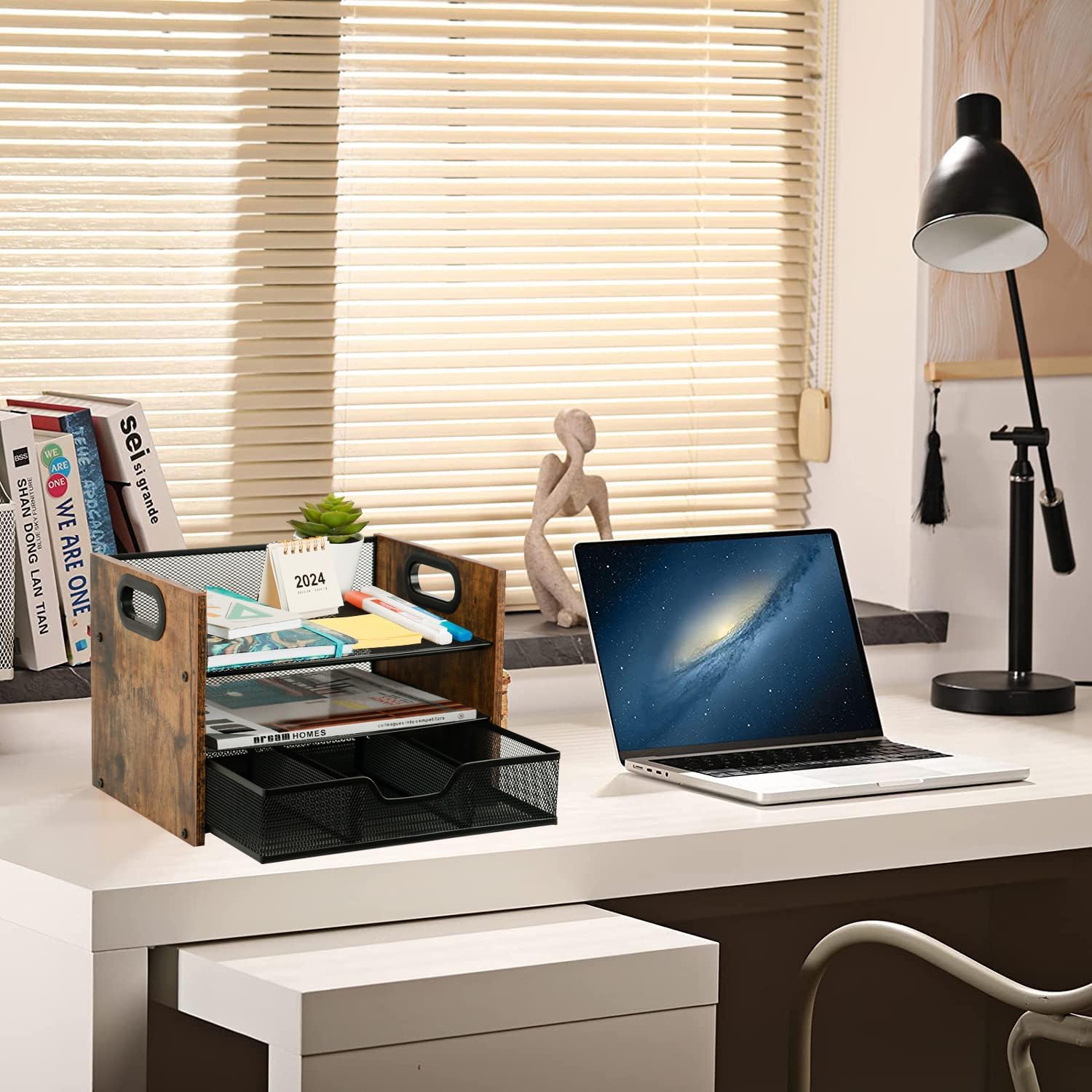 Wood Desk Organizer - 3-Tier Desktop File Organizer with Drawer, Wooden Paper Tray, Office Desk Organzier and Accessories for Papers, Mail, Notebooks, Stationery