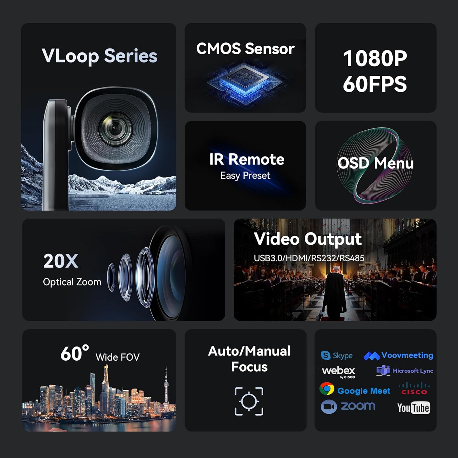 - ๐ใ๐๐ช๐ฎ๐ข๐ฉ๐ฉ๐๐ ๐ฐ๐ข๐ญ๐กใUSB 3.0, HDMI, RS485, and RS232 interfaces, the 20x zoom camera can seamlessly integrate into a variety of systems. Compatible with Zoom, Skype for business, Microsoft Lync(Teams), Voovmeeting, CISCO WebEx and other conferencing software. System Requirements: Windows 7, 8.1 or 10, Mac OS X 10.7 or higher. This versatility makes the VL20H an ideal choice for businesses seeking a flexible and adaptable video conference solution. โ โ IMPORTANT NOTICESโ โ NO AUDIO&AI Tracking function!
