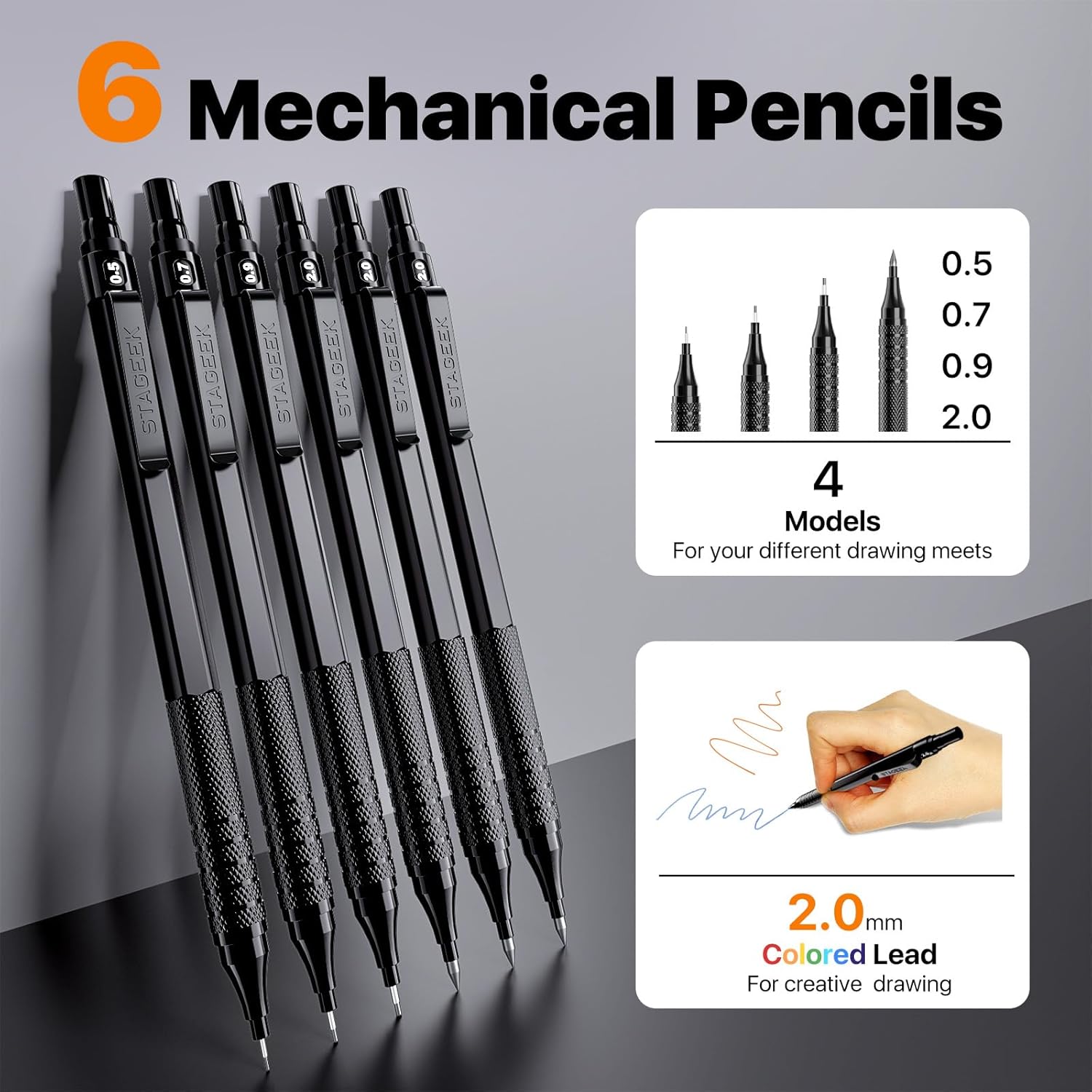 - 【4 Line Sizes & 6 Hardness】Mechanical pencil set includes 4 lead sizes (0.5/0.7/0.9/2.0mm) for versatile line widths. The 2mm graphite pencil features 6 hardness leads (6B/4B/2B/HB/2H/4H). 0.9mm & 2.0mm professional drawing pencils excel in mathematical drawing, sketch coloring; 0.5mm/0.7mm fine tips suit precision writing/recording. Switch effortlessly between deep/shallow strokes with multi-spec leads. Perfect for daily use: smooth writing, break-resistant, and convenient to use.