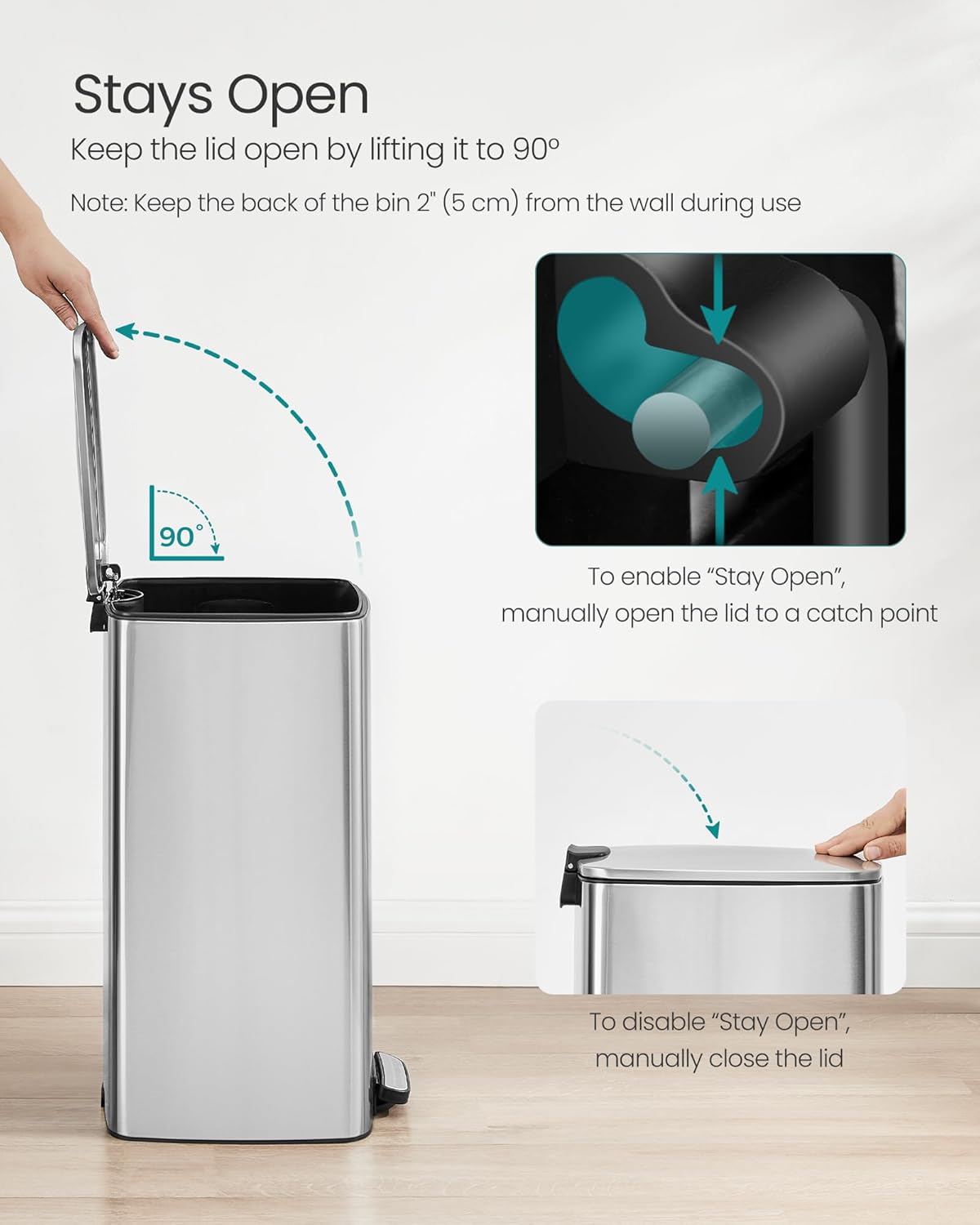 - ăSOFT-CLOSE & STAY-OPENăThis garbage can features a lid that closes quietly and gently without slamming shut. Additionally, you can keep the lid open by manually open it to 90° for easy waste disposal when needed