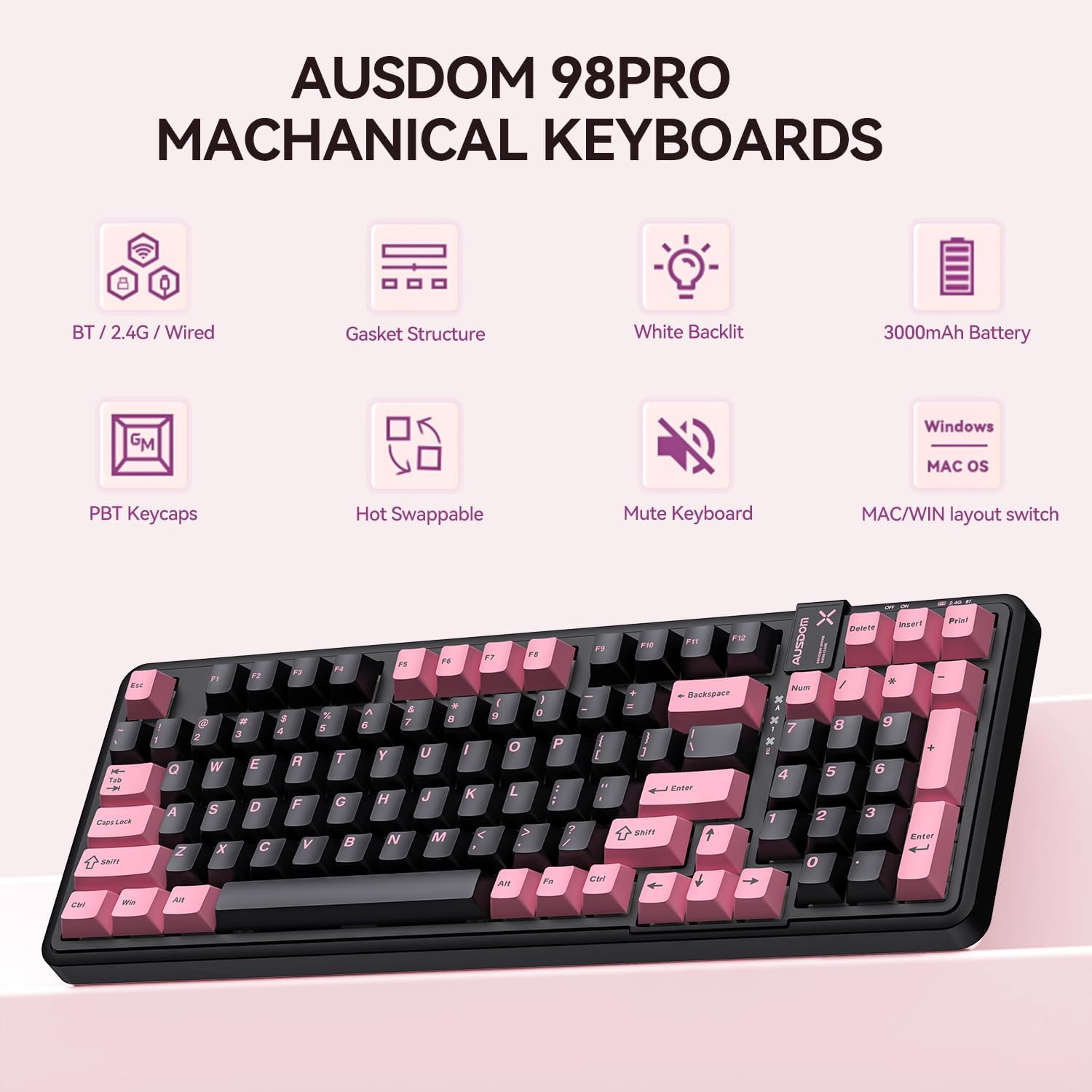 AUSDOM 98Pro Silent Wireless Mechanical Keyboard, Tri-Mode BT/2.4G/USB-C Hot Swappable Custom Quiet Keyboard with Backlit, Gasket Structure, PBT Keycaps, Pre-lubed Tactile Switches(Black Pink 97keys)