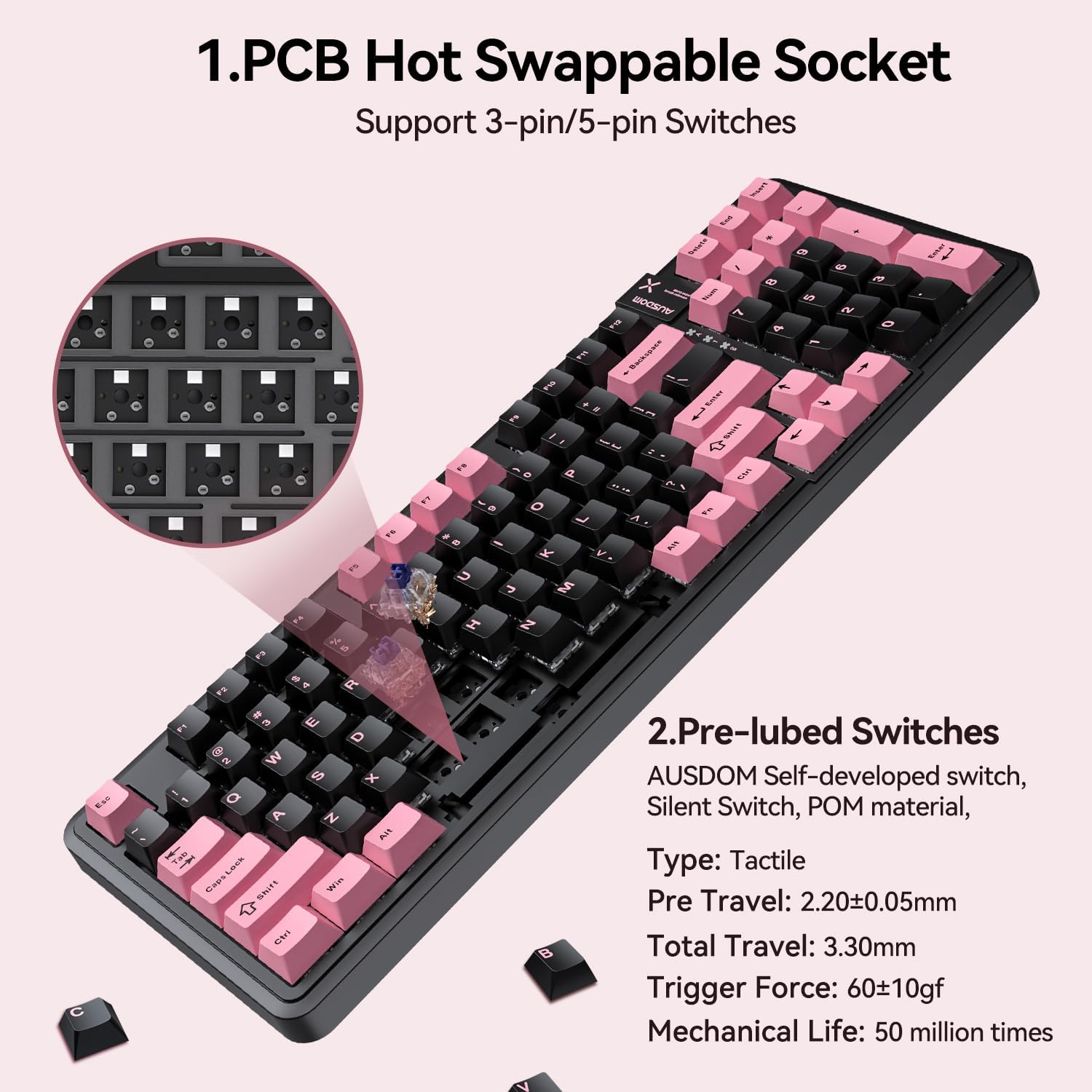 - Custom Keyboard: Our pink keyboard features hot swappable technology, which makes it easy to change keycaps and axes without disassembling the entire keyboard, and customise the layout and feel of the keyboard to your heart's content