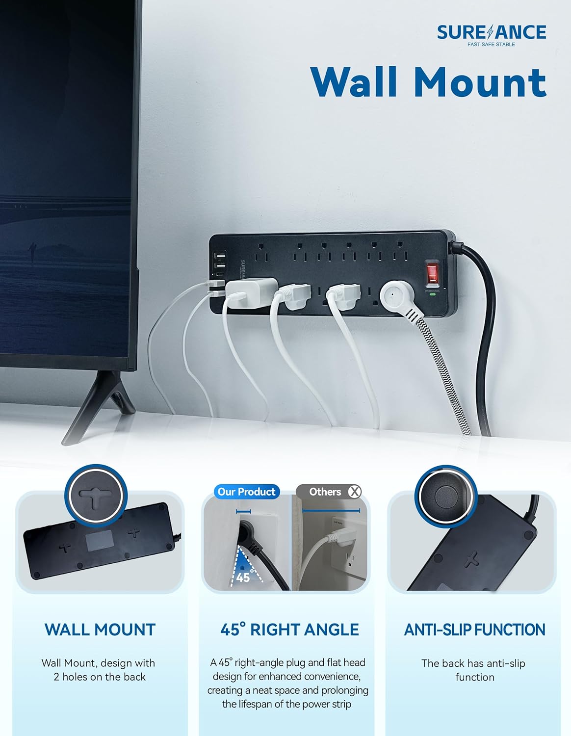 - 【Mountable and Flat Plug Surge Protector】The wall mount surge protector, designed with 4 holes on the back for easy installation. Featuring a flat plug with a slim profile, this power strip is perfect for tight spaces. The plug is also inclined at a 45-degree angle for convenient access and ease of use. The back features anti-slip pads for effective skid resistance. Excellent craftsmanship, durable with over 5000 plug and unplug cycles