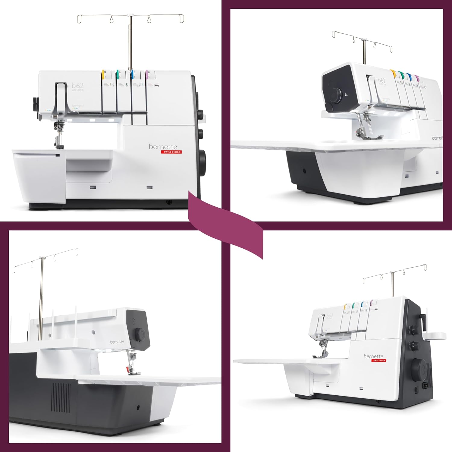 - ADVANCED SERGER MACHINE: The Bernette B62 Airlock is the perfect combination of precision and power. Featuring an automatic air threader, LED light, and LCD display, this heavy-duty machine excels at both quilting and embroidery. The bundle includes essential accessories like thread, bobbins, needles, and spools, along with an extension table, presser foot, and tools for professional-level stitching and sewing.