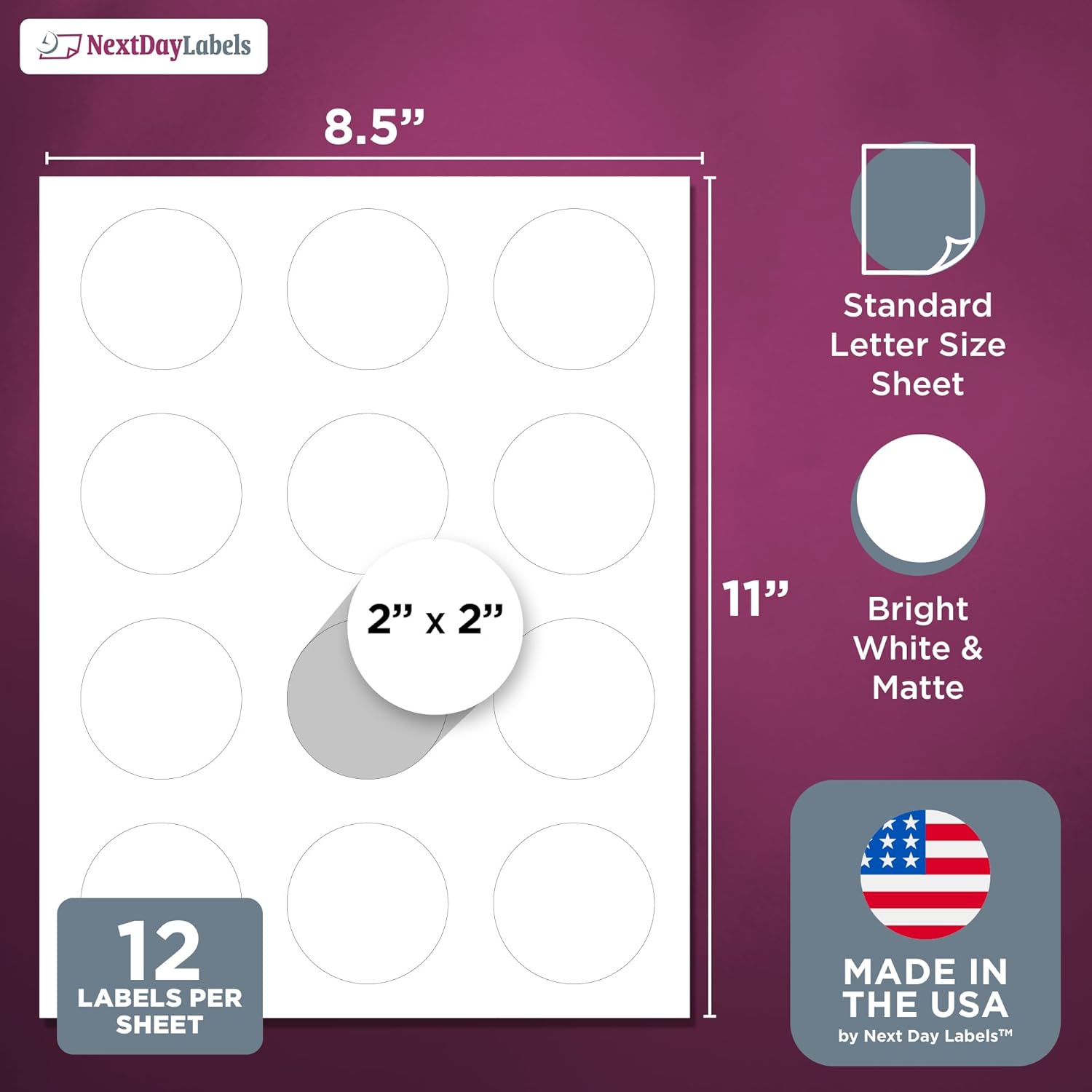 NextDayLabels - 2 Inch Round Matte White Blank Labels for Bleeds - Laser/Inkjet Printable Circle Stickers (50 Sheets, 12 Per Sheet, 600 Labels)