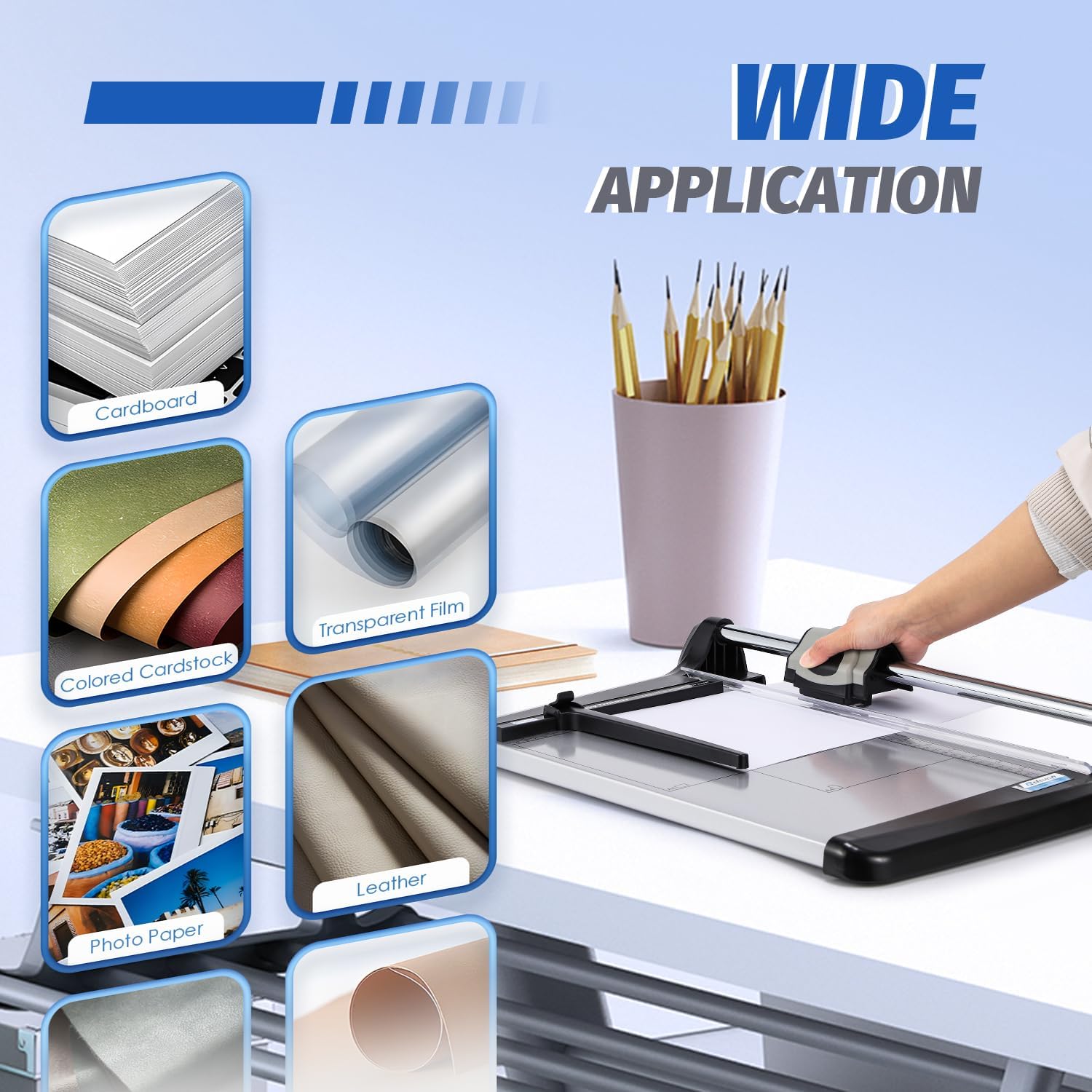 - 360mm(14.47") Cutting Length---This cutter can handle up to 360mm of material, which is about 14.17 inches. That's longer than the longest edge of a normal A4 sheet of paper. It's great for most cutting needs and is ideal for photo studios or drawing cutting.