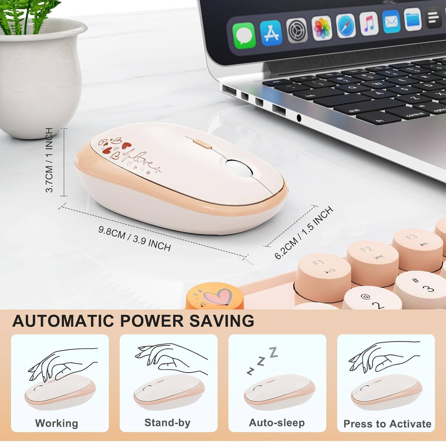 - ⊙ Fashion & Quiet Mouse Design Desk Accessories Keyboard - Stylish retro keyboard and mouse wireless with colorful round 104keys and glossy smooth edges to brighten your workspace. Featuring low-profile whisper-quet technology, this sleek combo ensures a distraction-free typing experience. Perfect for modern desks seeking cute wireless keyboard and mouse aesthetics.