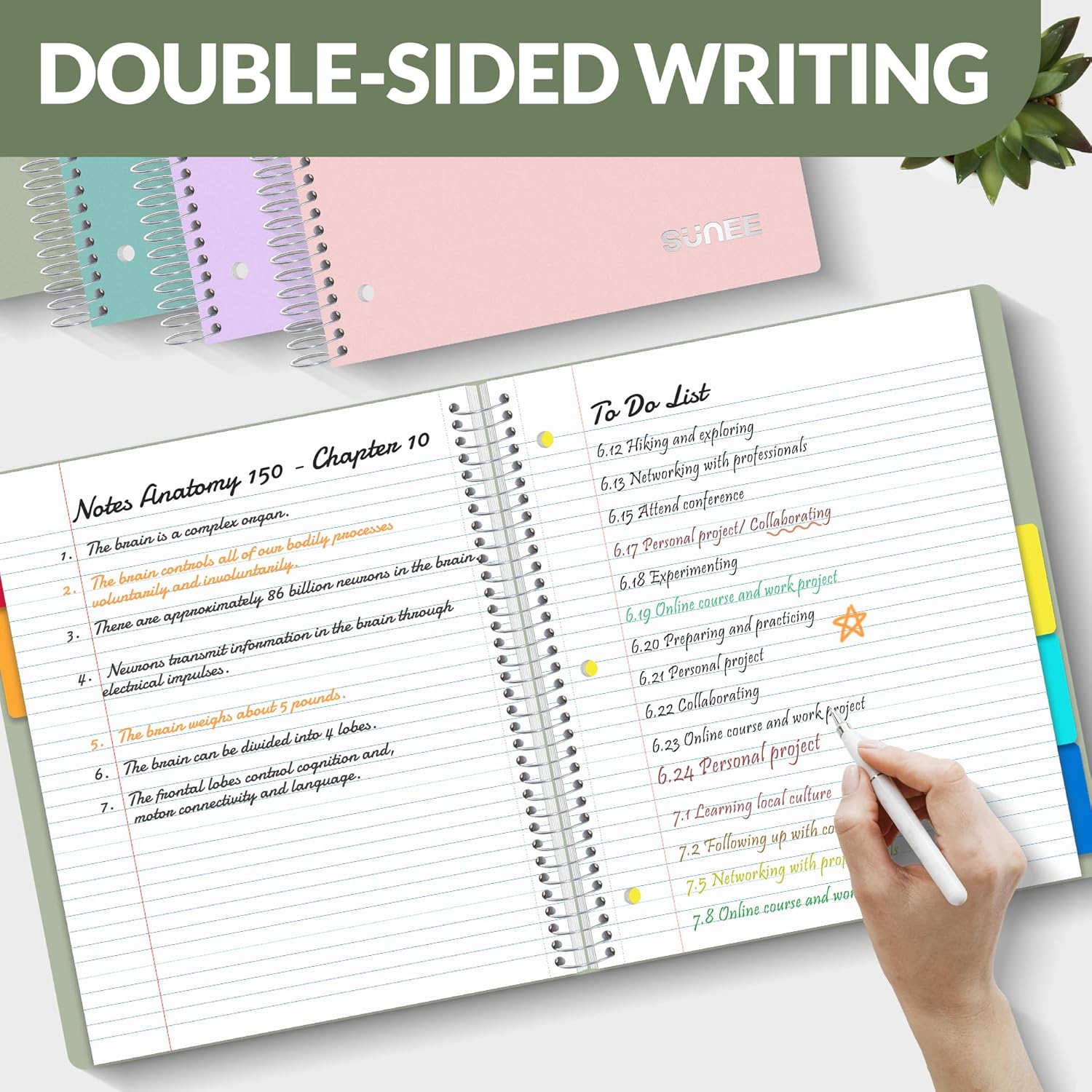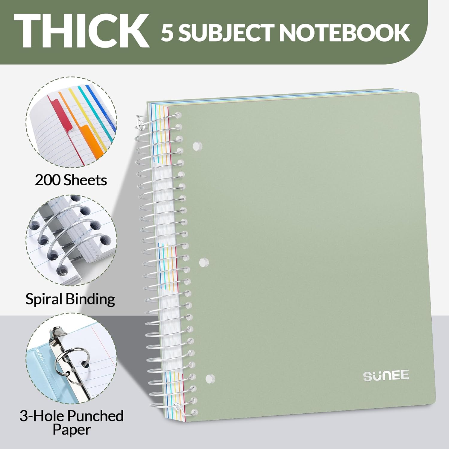 SUNEE 5 Subject Notebook College Ruled - 400 Pages, 9"x11", 5 Pocket Colored Dividers, 3-Hole Punched Paper, Sage Green