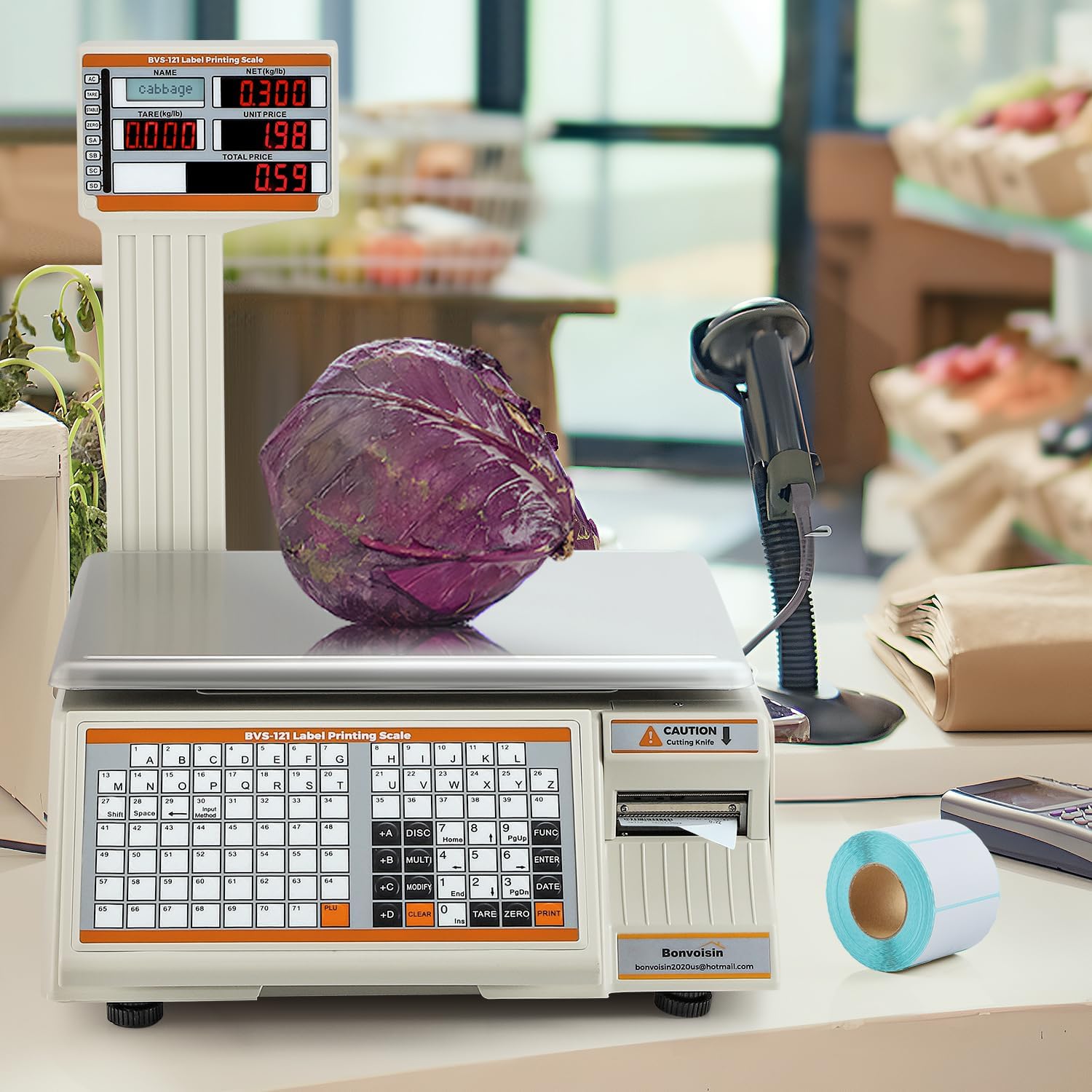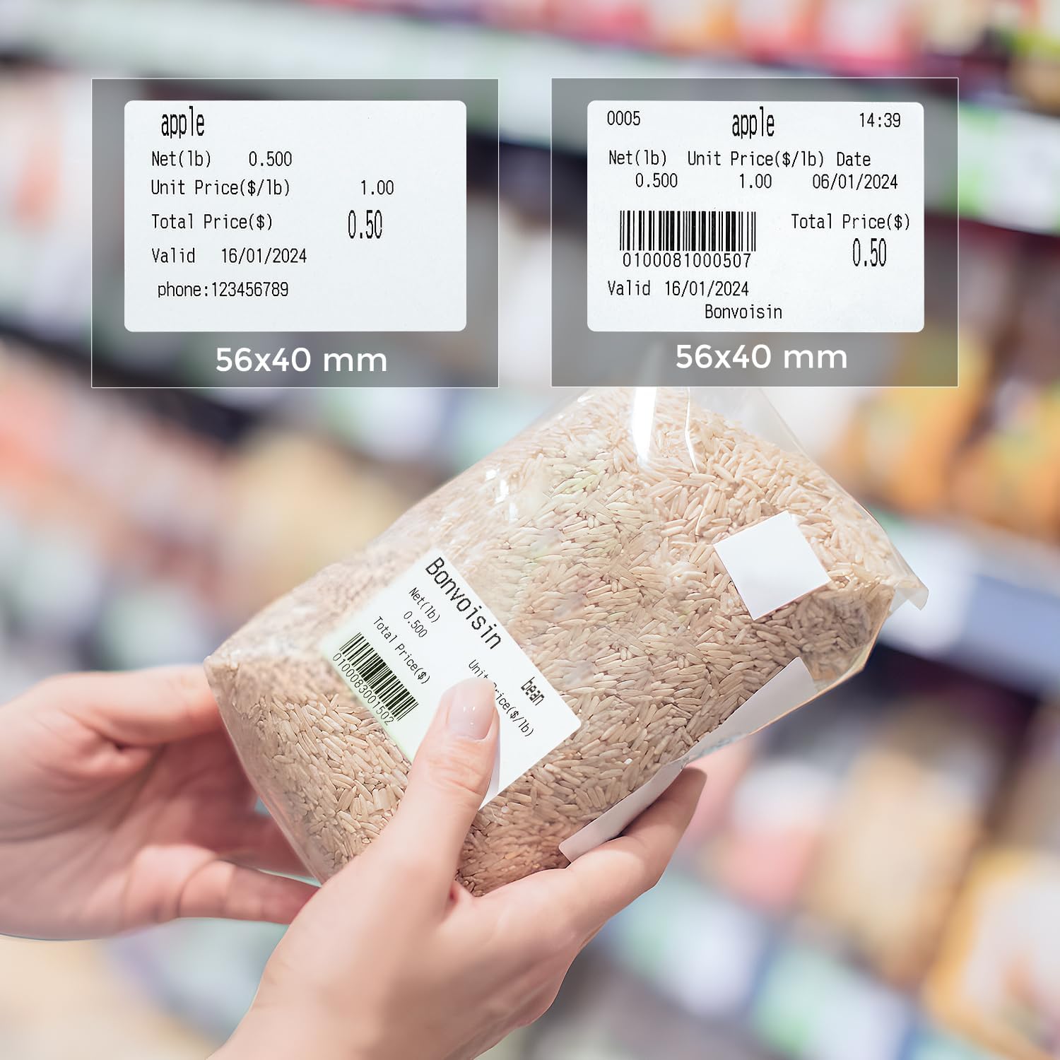- As for its size, the actual label size is 60 X 40 mm. But we'd recommend to set the label size on computer program as 56 x 40 mm (default setting of our bonvoisin barcode scale) or 58 x 40mm. So there will be some space around the label, which will display more clearly and not print outside the border.