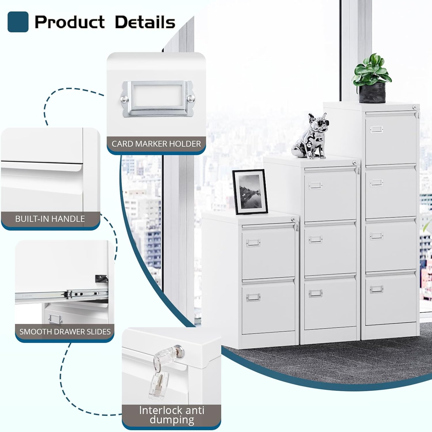 - 【File Cabinets with Lock】The top lock can secure all four drawers and protect your important paperwork, documents and books safe. To improve safe, this interlock system is also equipped with anti-tip mechanism, which is installed on each drawer side.
