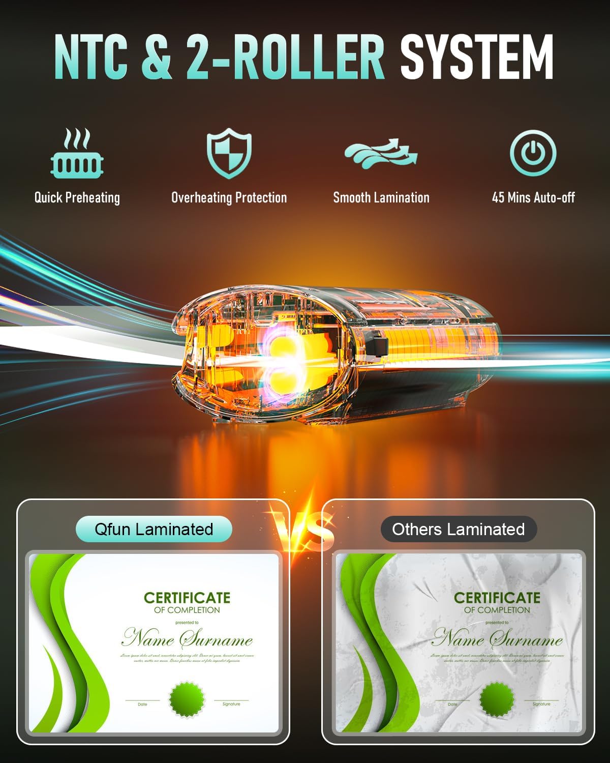 - Even Heating And High Safety: The laminate machine is equipped with an intelligent temperature control (NTC) system that provides precise temperature control and ensures excellent laminating results. The lamination machine is equipped with auto shut-off and overheating protection, it automatically shuts off after 45 minutes of non-working to avoid overheating, saving energy and prolonging its service life, which is safe and energy-saving no matter you are in school, office, or at home