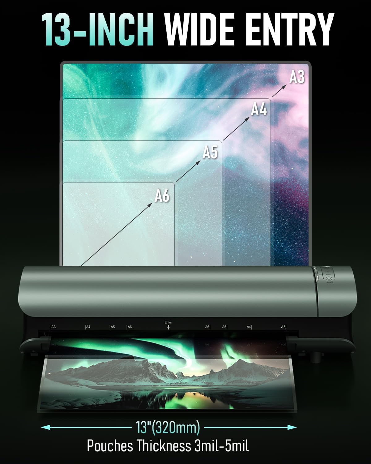 - Portable Laminator Machine 13 Inch Wide: Easily handles a wide range of paper and photo sizes including A3/A4/A5/A6. From documents and training materials to menus, posters, drawings, photos and bookmarks. Simply choose the right film thickness for professional grade laminating results.Tips:It is normal that there may be an odor the first time you use it, and it will gradually disappear after a few uses. (Odor is heated laminate odor, safe and non-toxic)