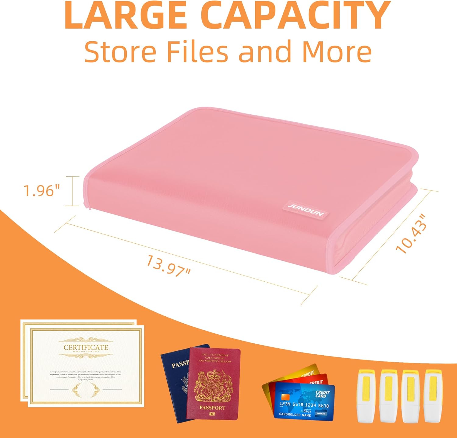 JUNDUN Accordion File Organizer - 12 Pocket Expanding File Folder with Zipper & Labels - Fireproof File Folder Organizer with Multi-Pockets,Document Organizer for Letter A4 Files and More (Pink)