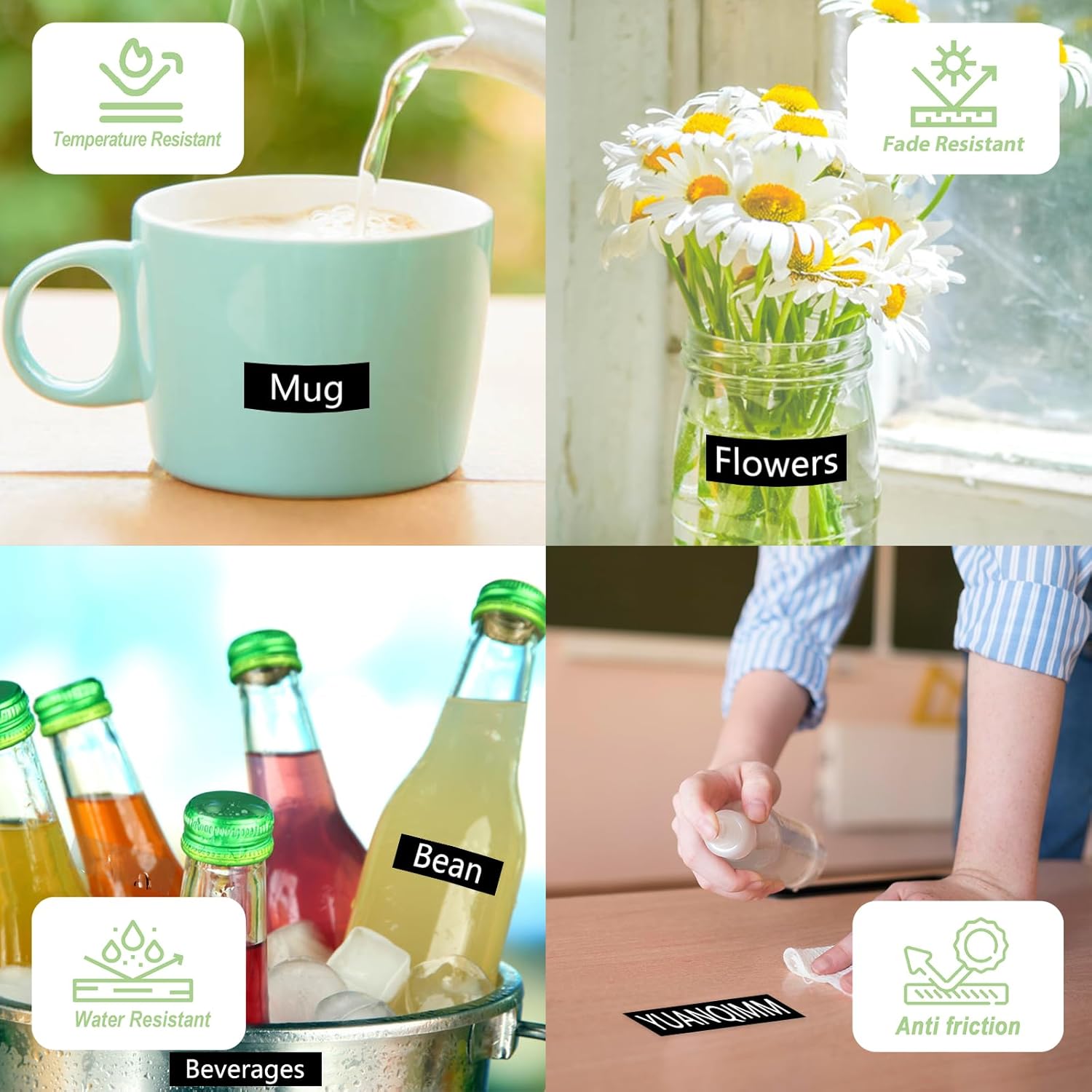 - Features: Water resistant, Fade resistant, Temperature resistant, Corrosion resistant, Abrasion resistant, Grease resistant, Grime resistant and Chemical resistant
