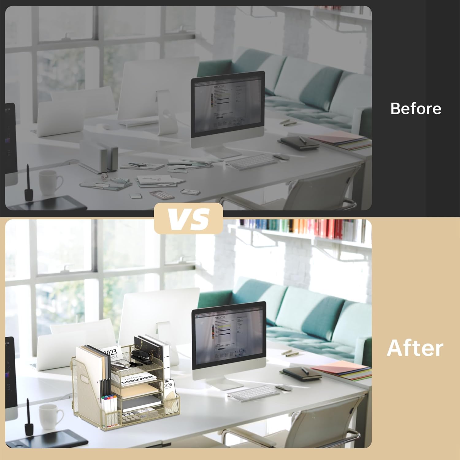 - [Comprehensive Desk Organizer] This desk organizer comes with 4 sliding trays, 2 vertical magazine racks, 2 pen holders and 1 sliding drawer. Equipped with such a complete desk organizer, it is definitely your first choice for office accessories!