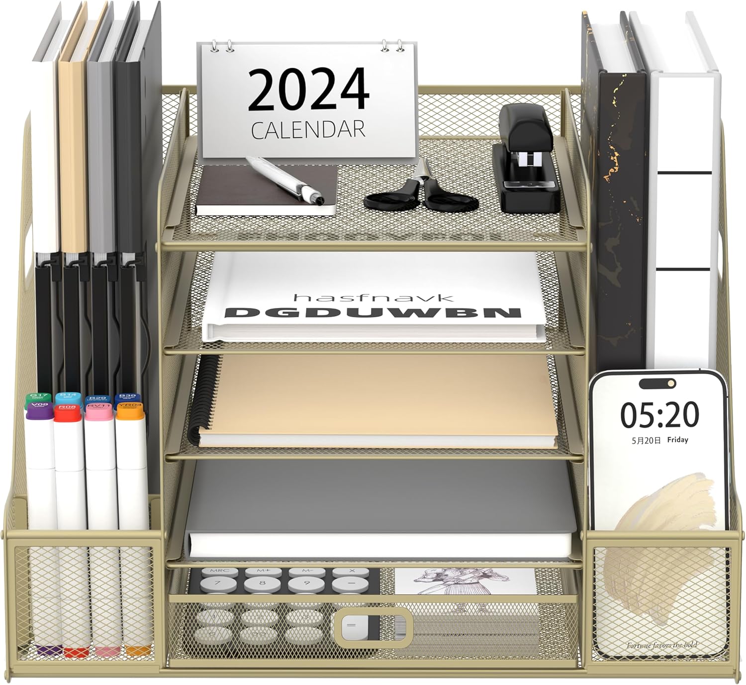 - [Large Capacity File Organizer] This desktop organizer has five tiers, each of which has a lot of space. There is also a lot of space on both sides of the file organizer, as well as the pen holders and drawer, a large file container that can hold books, notebooks, a4 paper, and other small items is ideal for organizing files.