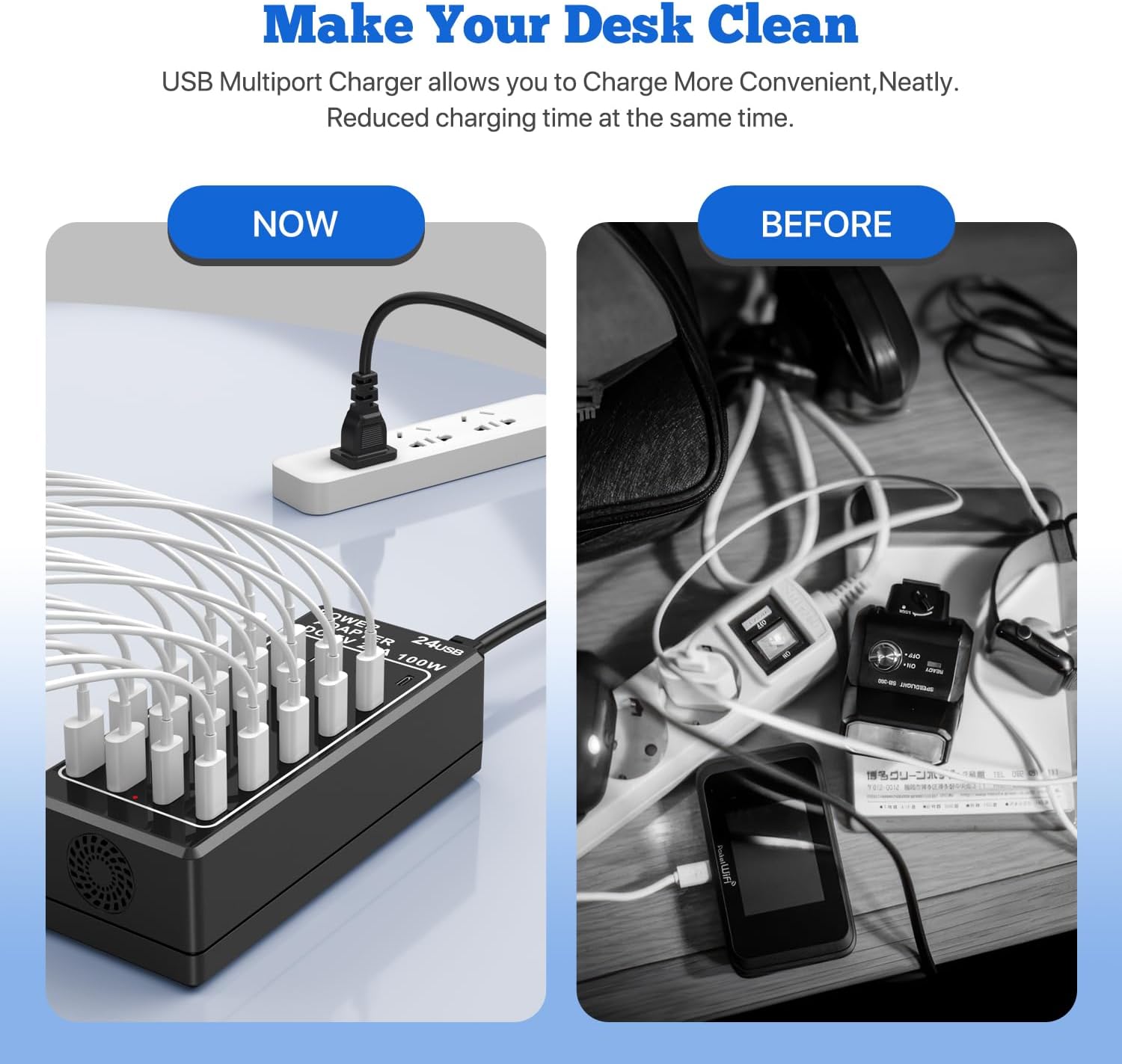 - ⚡【24 Port Charging Station】USB Charger Station Block with 12-USB-C ports and 12-USB-A ports(Each port max 2.4A), allowing multiple devices to charge simultaneously, with a total output of up to 100W. The USB C Charger Block provides the fastest charging speed and intelligently detects the power demand of each port of the connected device, ensuring safe and fast charging of the charger.