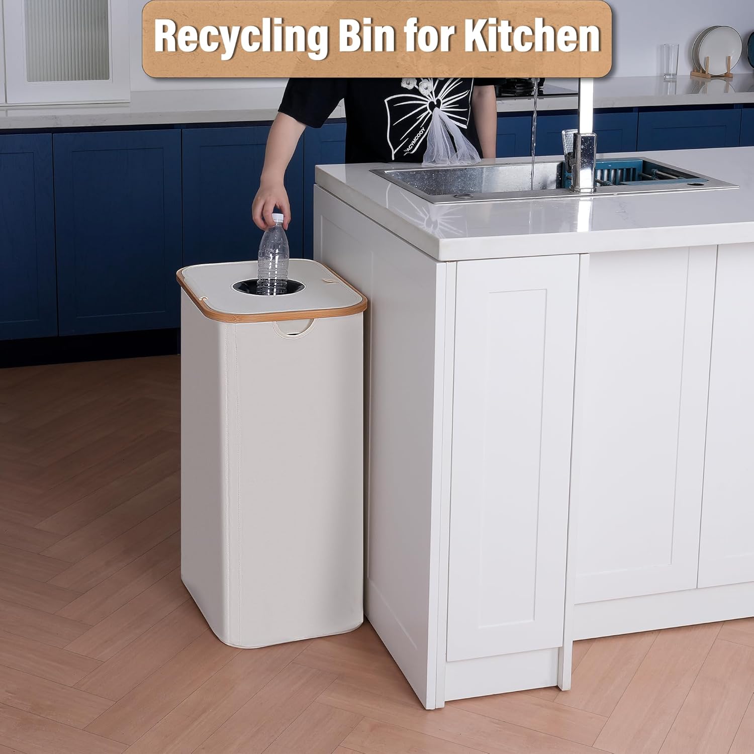 - 【Design with lid and bamboo handle】The recycling bin for kitchen has a collection hole, and you can easily put in empty bottles without opening the lid. The recycling bin for kitchen is made of Oxford cloth and bamboo basket, using environmentally friendly materials, lightweight, thick Oxford cloth is durable, not easy to damage, lightweight, breathable fabric, easy to clean.