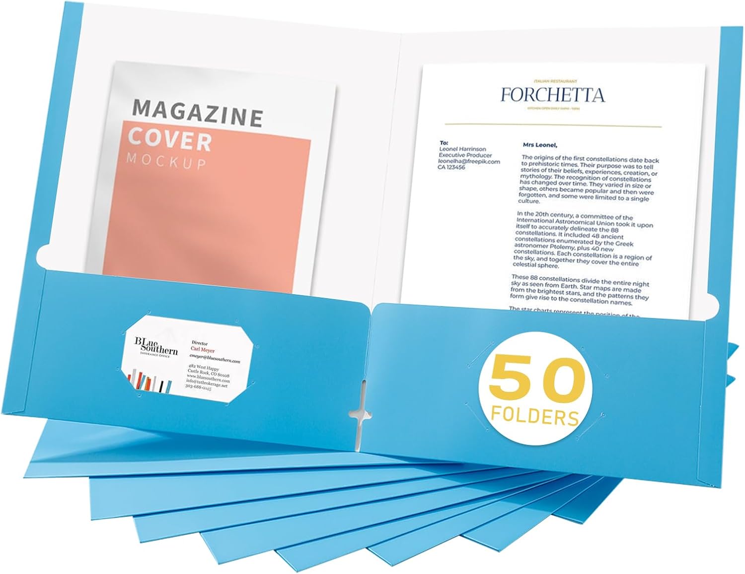 - PACKAGE INCLUDES: 50 packs light blue file folders with 2 pocket folders and 2 business card slot, 100 plus Sheet Capacity, enough use for you, perfect for school, paperwork, office, business.