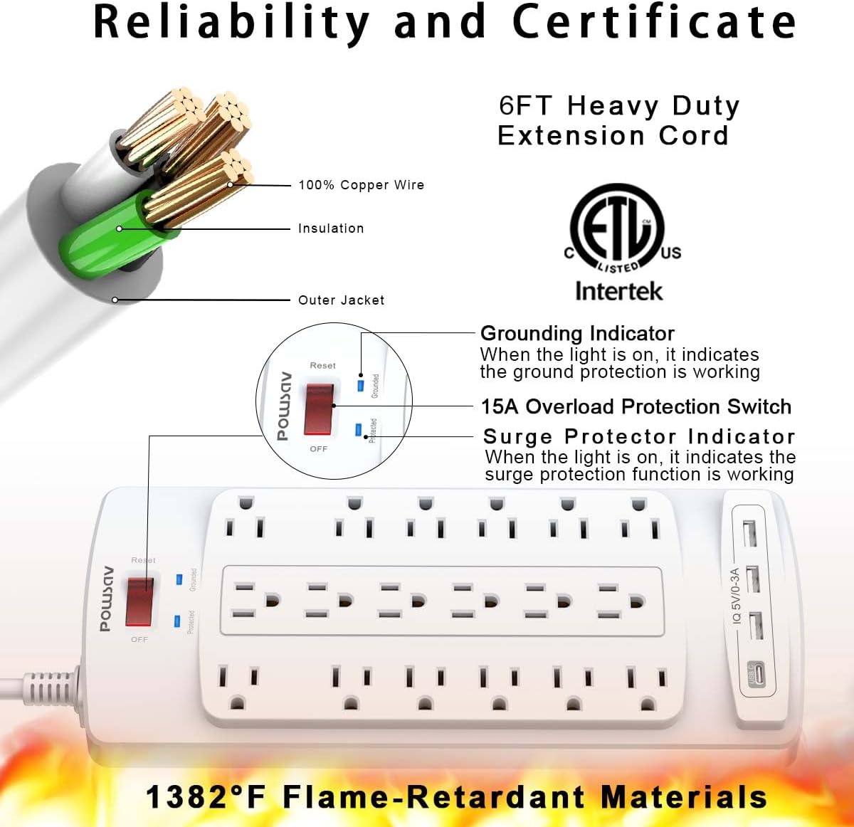 - Safety and Certificate: ETL safety certified, with extension cord and other major components certified by UL. The over current protection switch limits the power strip's working current to certain setting, so it will not get hot during usage. Environmental protection and fire-resistance PC shell with flame retardant at 1382℉ makes it more durable and longer lifetime.