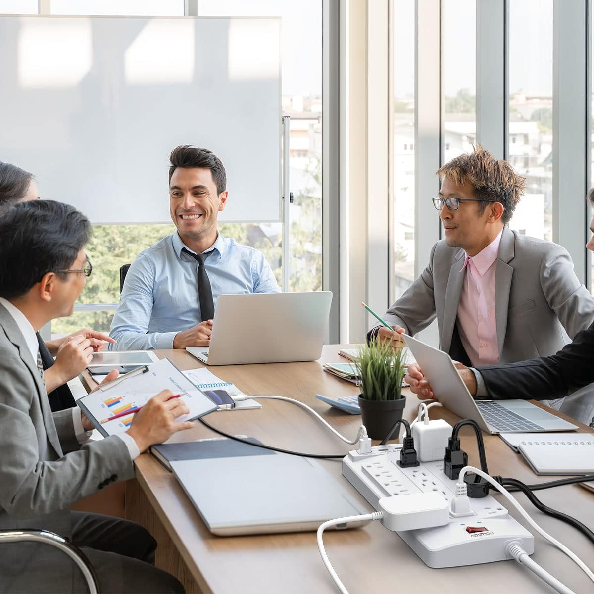 - Power Strip with 18 outlets & 4 USB Ports: 18AC outlets & 4 USB ports (5V/3.0A, 17W) power strip with 10 feet Flat Plug Heavy Duty power extension cord(1875W/15A), surge protector(2100 Joules) with overload protection protects against spikes and fluctuations,Lots of outlets for a computer desk works great for all the electronics a gamer needs.
