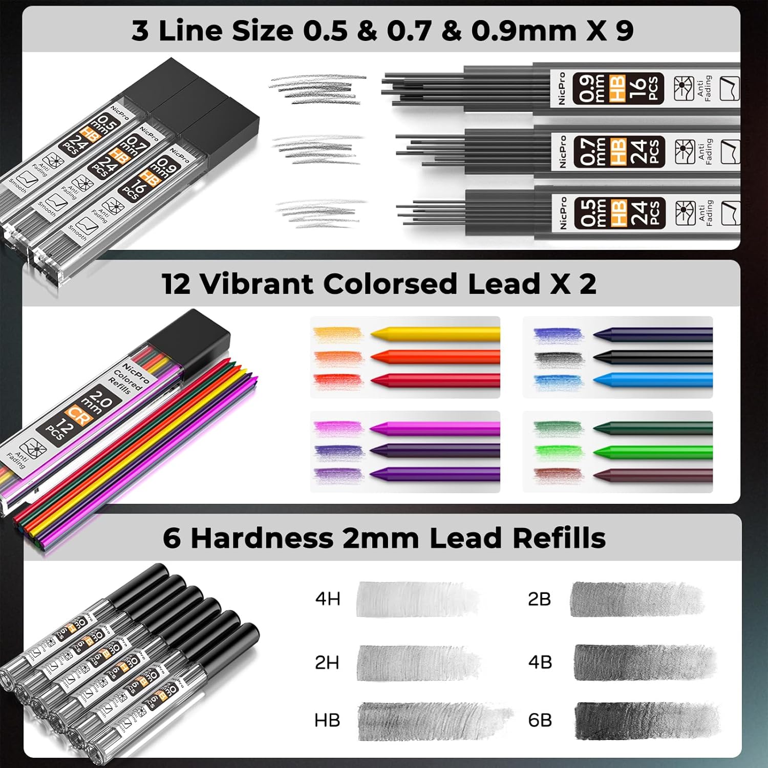 Nicpro 37PCS Art Mechanical Pencil Set, Metal Drafting Pencils 0.5 mm, 0.7 mm, 0.9 mm & 2mm Lead Pencil Holder (6B 4B 2B HB 2H 4H Colors) For Sketching Drawing With 20 Tube Lead Refills Eraser Case