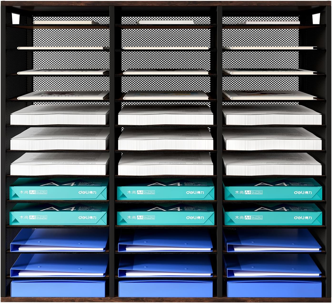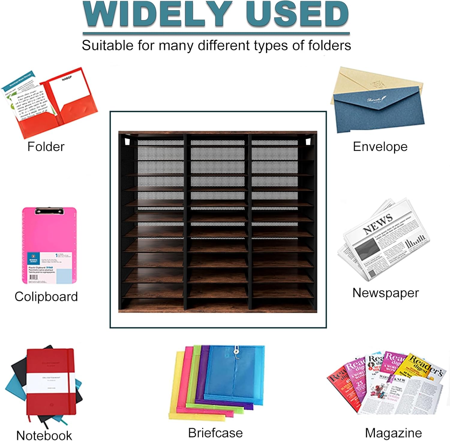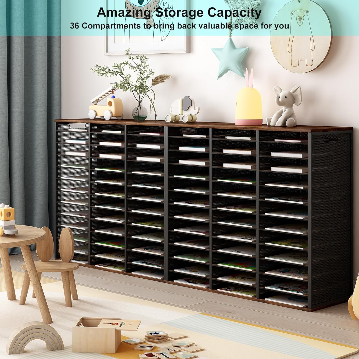 - â–¶Amazing Storage Capacity and Space-saving. The literature organizer has 36 compartments, which can help you sort, store and organize literature, magazines, comic books, files, student assignments, binders, catalogs, diaries, papers and documents on your desk or counter quickly and easily and get you valuable workspace back