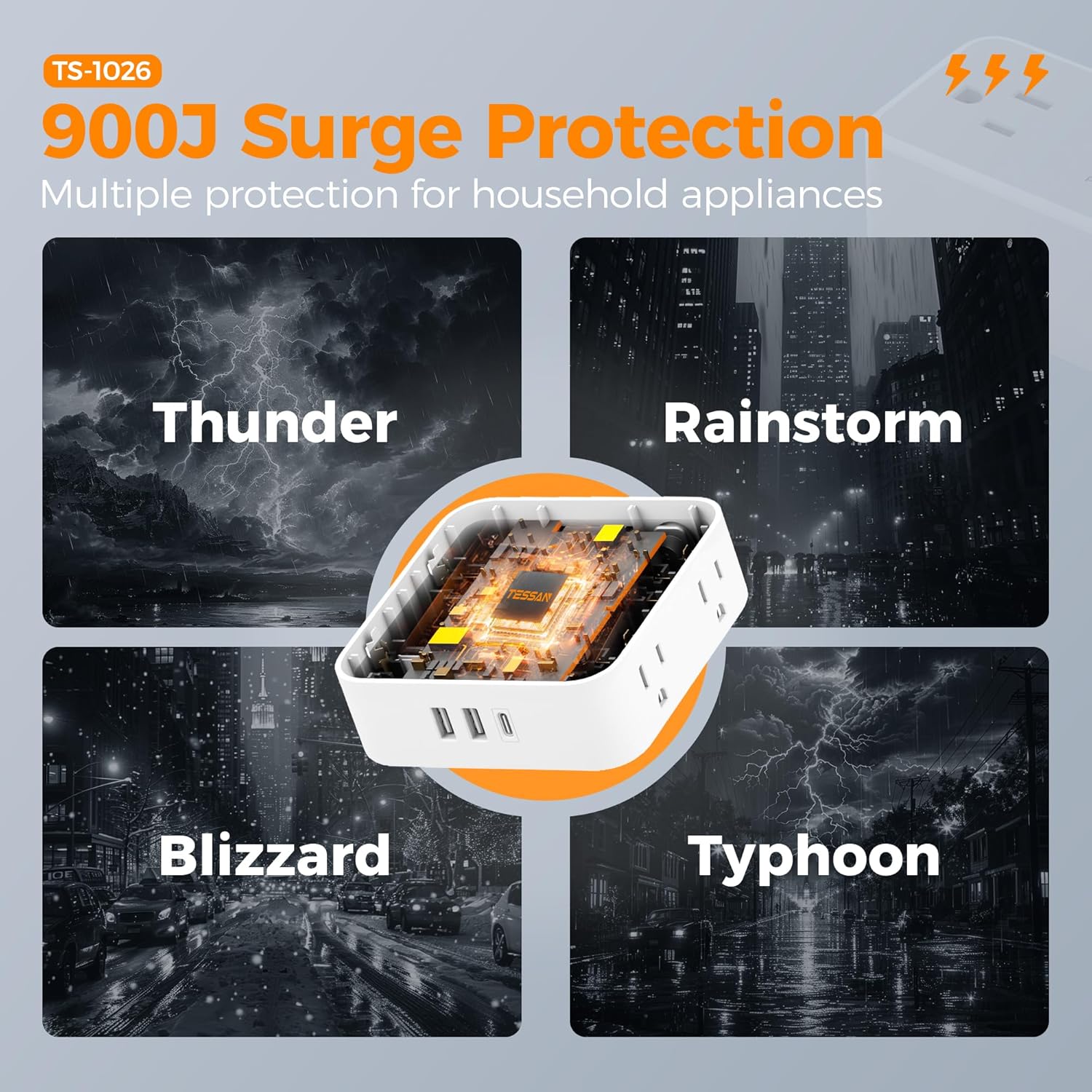 - 900J Surge Protector Outlet: Equipped with overload protection, short-circuit protection, over-current protection, and etc; Reliable on/ off switch can automatically shut off and protect your expensive electronics, providing you with a safe and reliable charging environment
