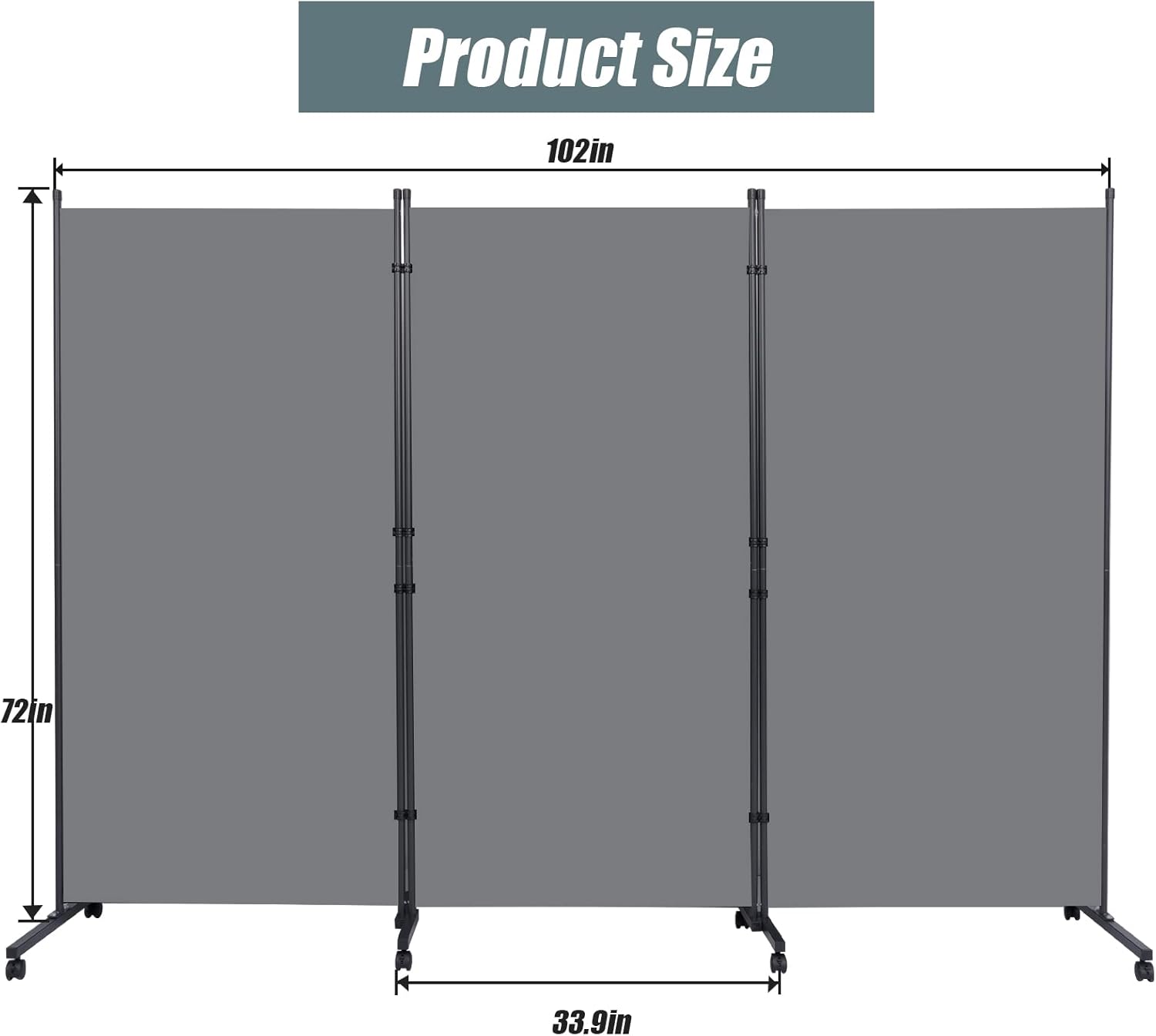 - Movable Quiet & Smooth: Our Room Dividers equipped with 15.75 inch/40 cm steel casters and 8pcs PE universal wheels, which allow you to move it anywhere easier. We also added 4 brakes for each leg, and you are free to let it pause to prevent it from sliding to improve the stability of the privacy screen. The 3 Panel Wall Divider Size: 102''W X 72.2''H, Each Panel Size: 34''Wx72.2''H