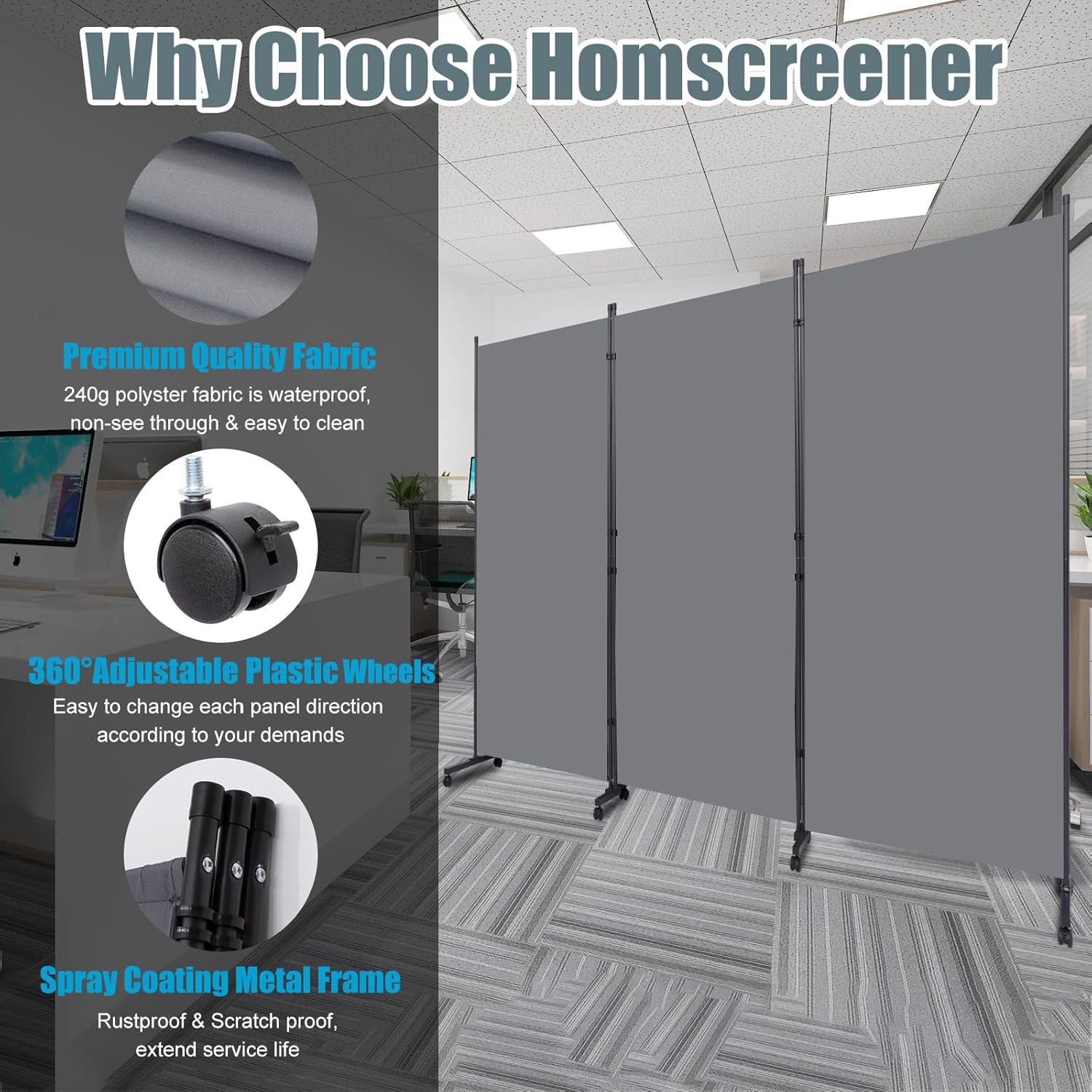 - Upgraded Fabric & Reinforced Structure: Homscreener Room Dividers and Folding Privacy Screens are made of thickened opaque fabric and premium stable steel frame. PA-coated Room Divider Wall with waterproof and wrinkle resistance, and the metal frame is sprayed with a frosted coating to resist rust and scratches. Our upgraded room divider is stronger and stands up straighter, lasting long time service-time