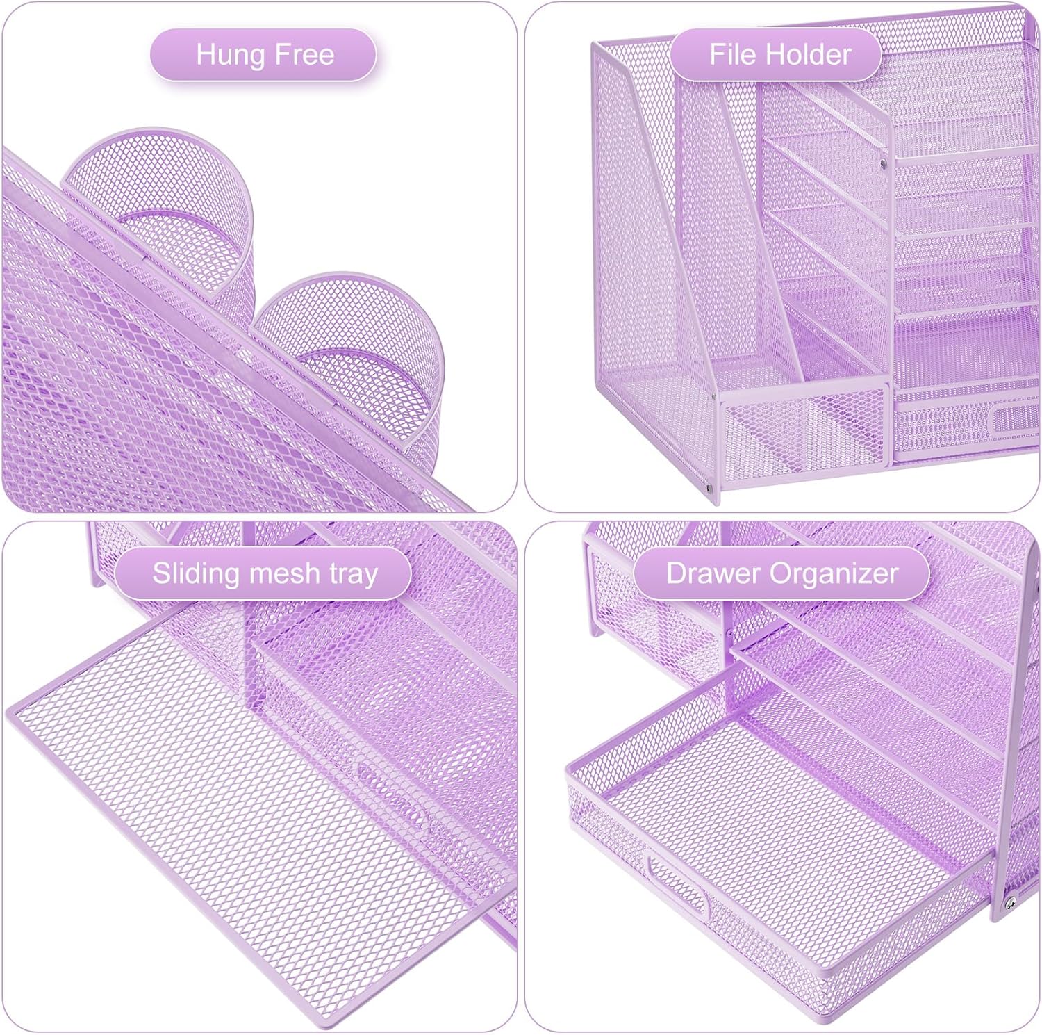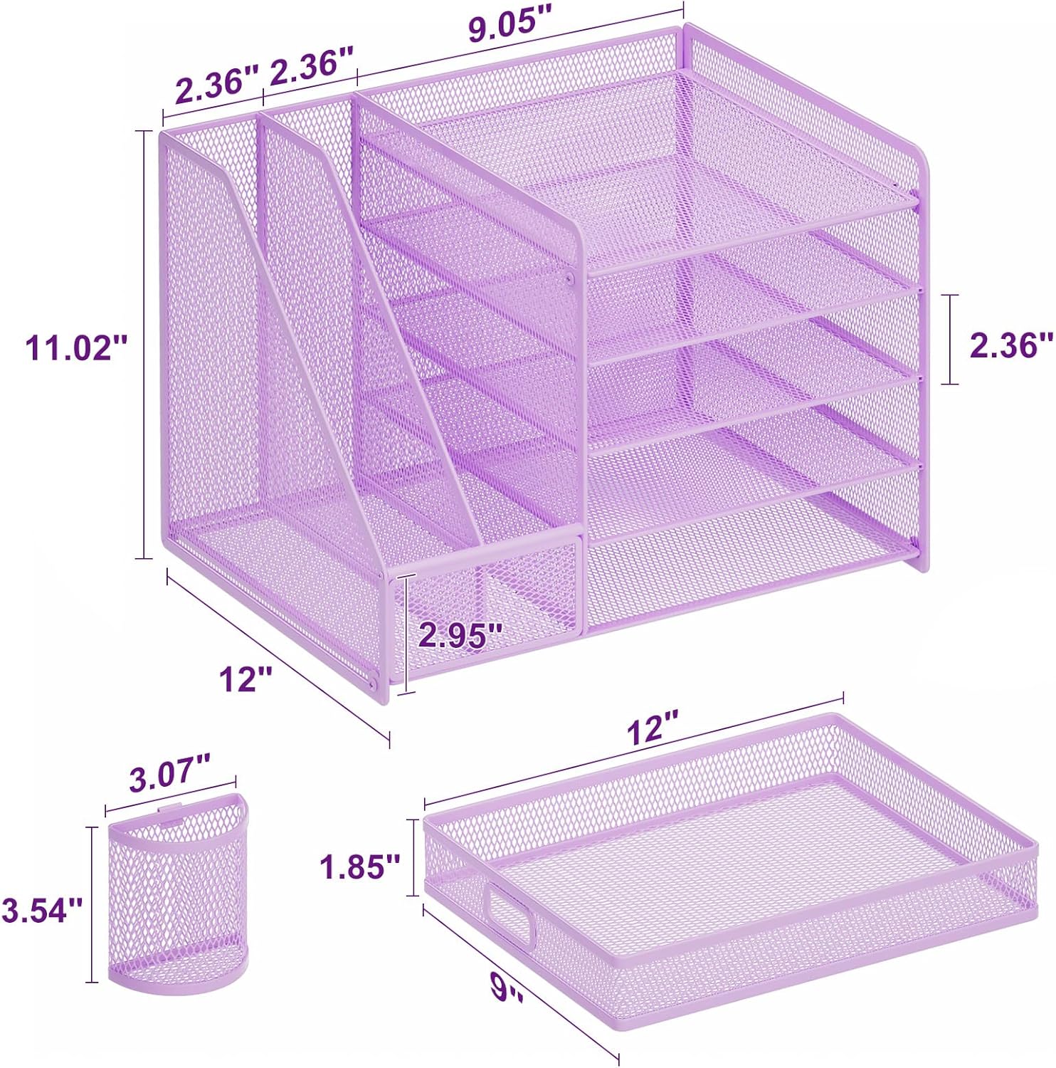 Marbrasse Desk Organizer with File Holder, 5-Tier Paper Letter Tray Organizer with Drawer and 2 Pen Holder, Mesh Desktop Organizer and Storage with Magazine Holder for Office Supplies(Purple)