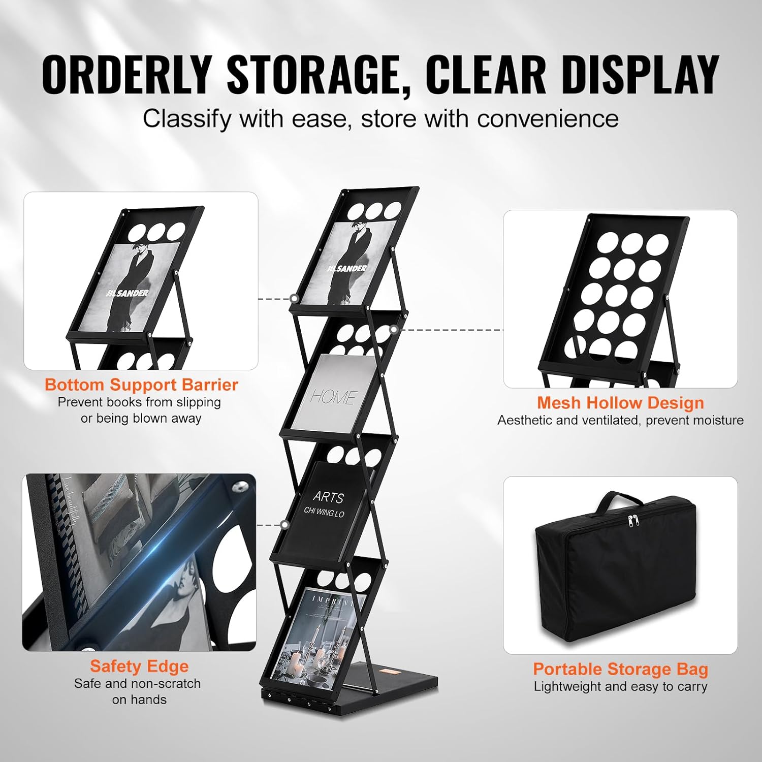- Quality Craftsmanship, Lasting Durability: Crafted with meticulous attention to detail, VEVOR 4-tier 4 pockets foldable brochure display stand boasts a smooth and sturdy metal construction. No more worries about fade and deformation – this literature display stand is built to endure the test of time.