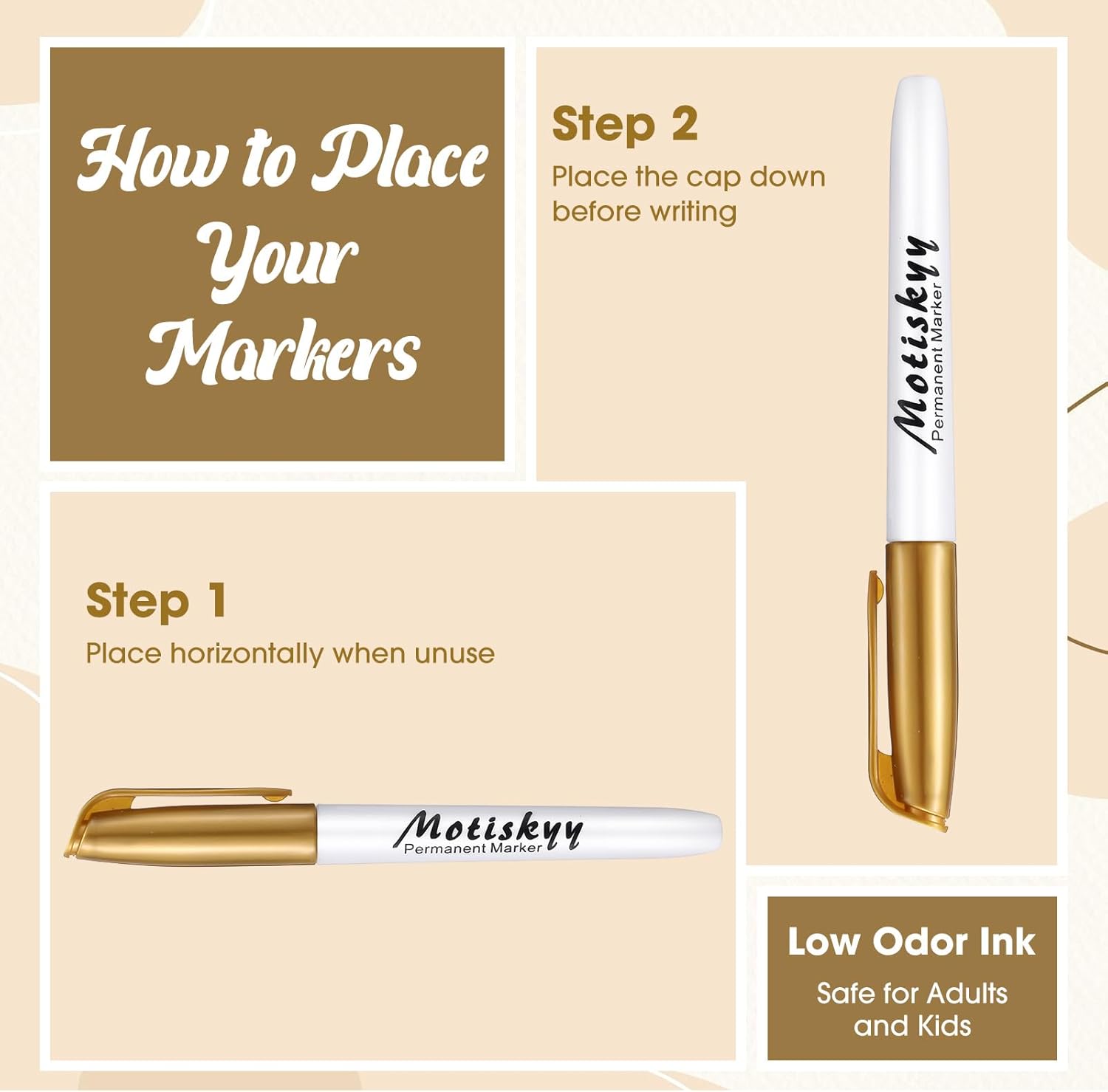 - Easy to Use: our gold metallic markers pens are ready to write by simply opening the cap, no shaking or pumping required; And this marker uses a quality ink formula that leaves permanent marks on light and dark surfaces; Please note: after marking or drawing, you need to wait a few minutes for the ink to dry