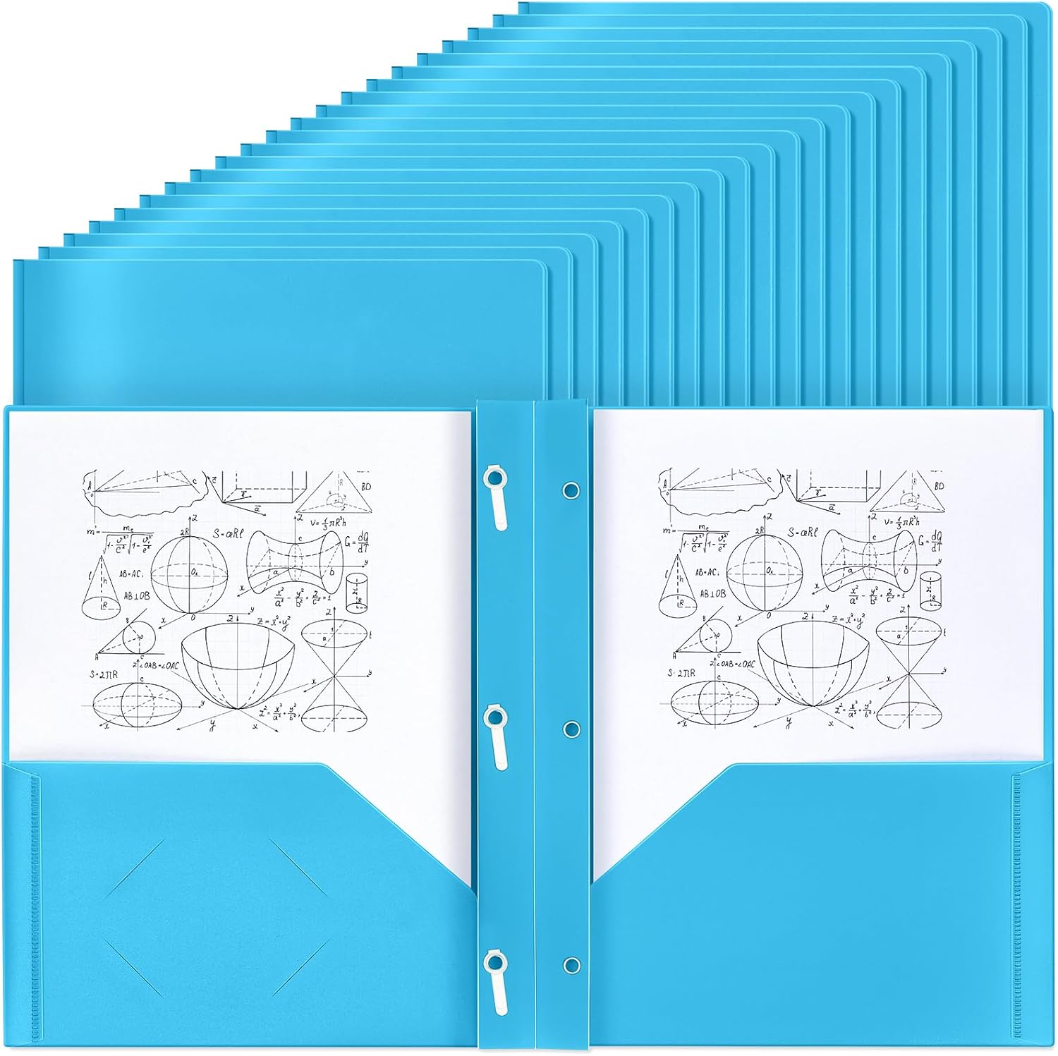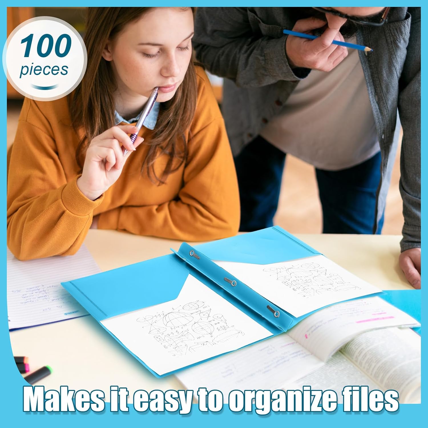 Lincia 100 Pcs Plastic Folders with Pockets and Prong Folders with Prongs Plastic Folders with 2 Pockets Pocket Folders for Office, School for Students, Teachers, Office Workers (Light Blue)