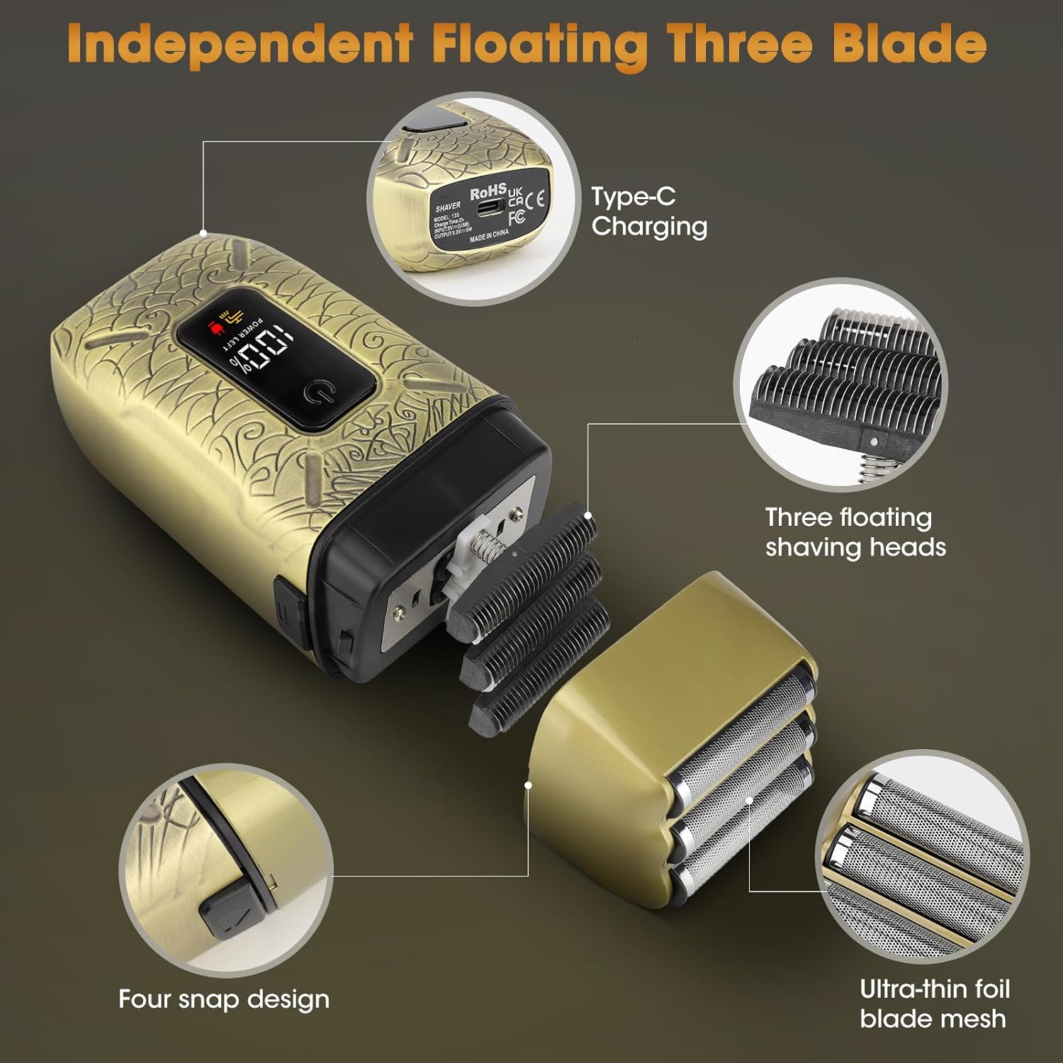 - Classic Men's Foil Blade Shaver: The electric shavers is equipped with intelligent three floating shaving heads for a close shave on the neck, face and hairline. Professionally designed ultra-thin hypoallergenic titanium foil for a bump-free, ultra-close shave for zero finishes, ideal for even the most sensitive skin. The design of three independent floating blade nets increases the contact area and the shaving efficiency is higher.
