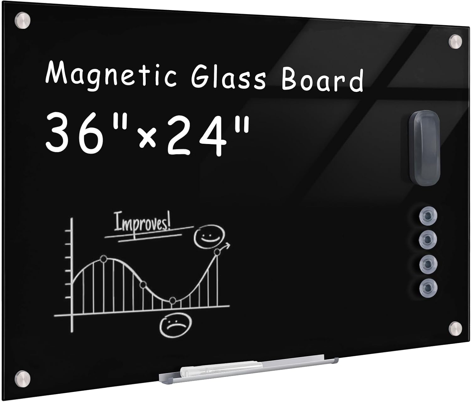 Magnetic Glass Whiteboard,36"x24" Wall Mounted Frameless Dry Erase Board for Office, Home & School Black