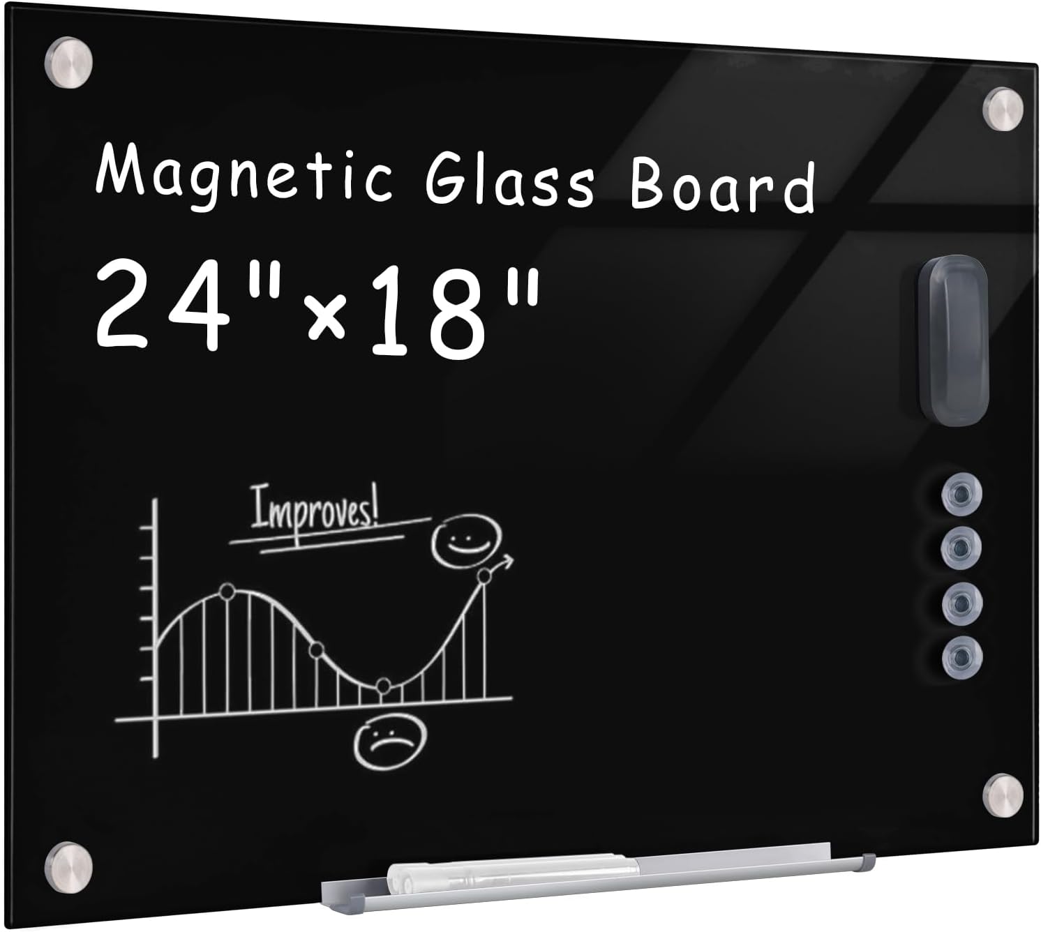 Magnetic Glass Whiteboard,24"x18" Wall Mounted Frameless Dry Erase Board for Office, Home & School Black
