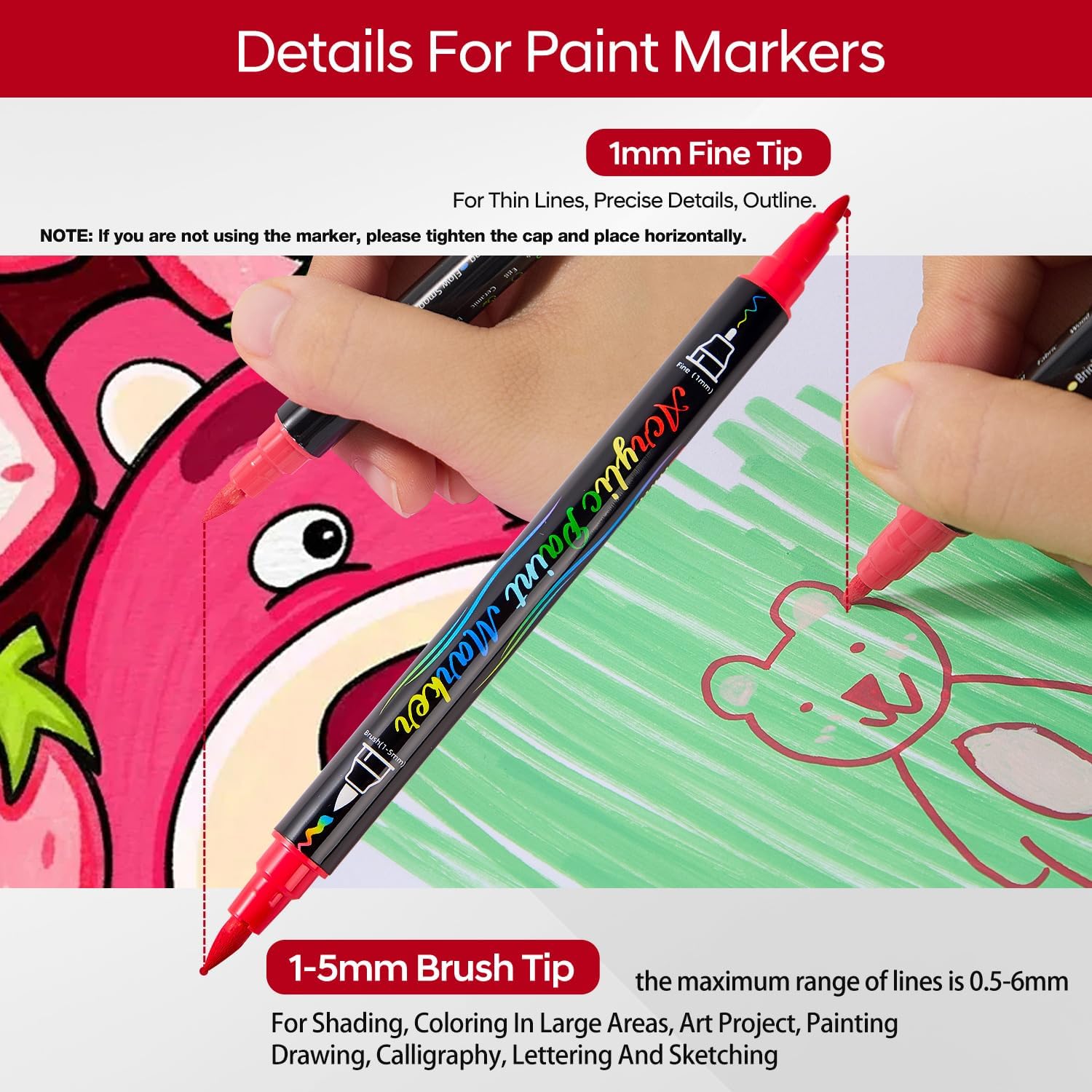 - PREMIUM DUAL-TIP ACRYLIC PAINT MARKERS: Each paint pens come with a 1-5mm(the maximum range of lines is 0.5-6mm) flexible fiber brush tip and 1mm fine tip. You can drawing, sketch, calligraphy and outline with the fine nib, the brush tip is made of premium soft fiber material that is wear-resistant, no branching and durable, which is suitable for large-scale painting, coloring multiple colors layered on top of each other will not result in paper penetration.