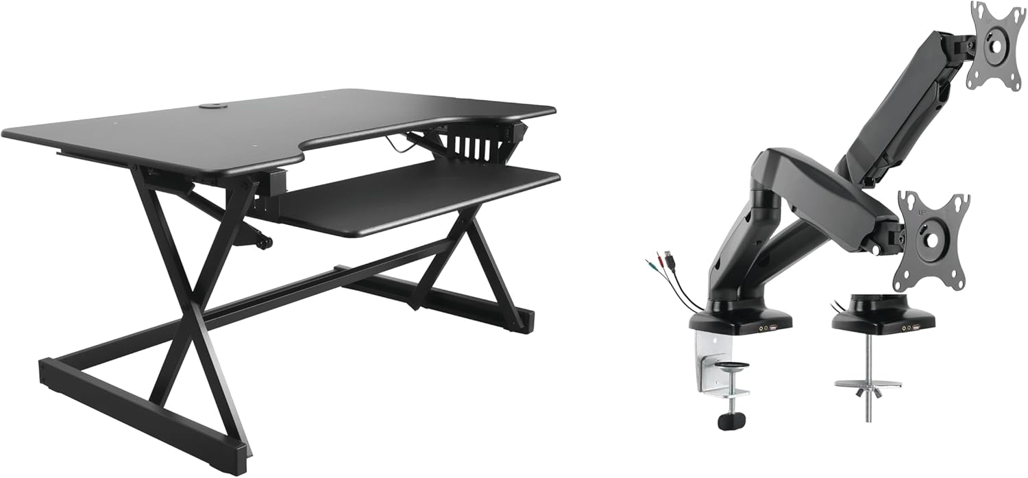 - Standing Desk Converter Bundle includes 40" desk riser (R DADRB-40-ACUSB) and Premium Dual Monitor Arm (R MA2) for easy ergonomic positioning of 13"-27" flat panel monitors to optimize viewing comfort. R MA2 includes a grommet mount to install.