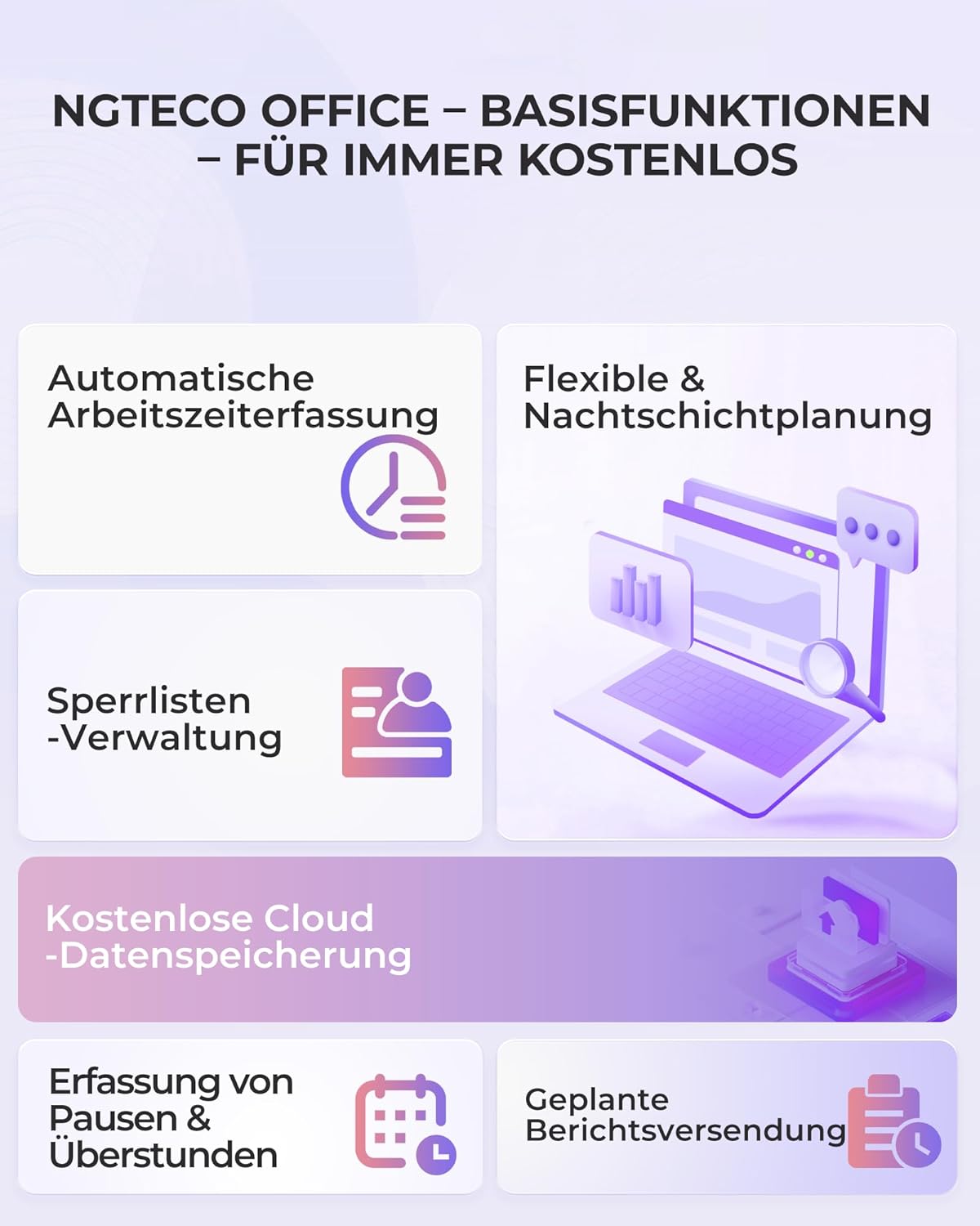 - Free Cloud Service: The TC1 Cloud-Connect time clock, powered by NGTeco Office software and app, allows you to access real-time punch data from anywhere. Benefit from accurate hour calculations and automatic report generation through any web browser.