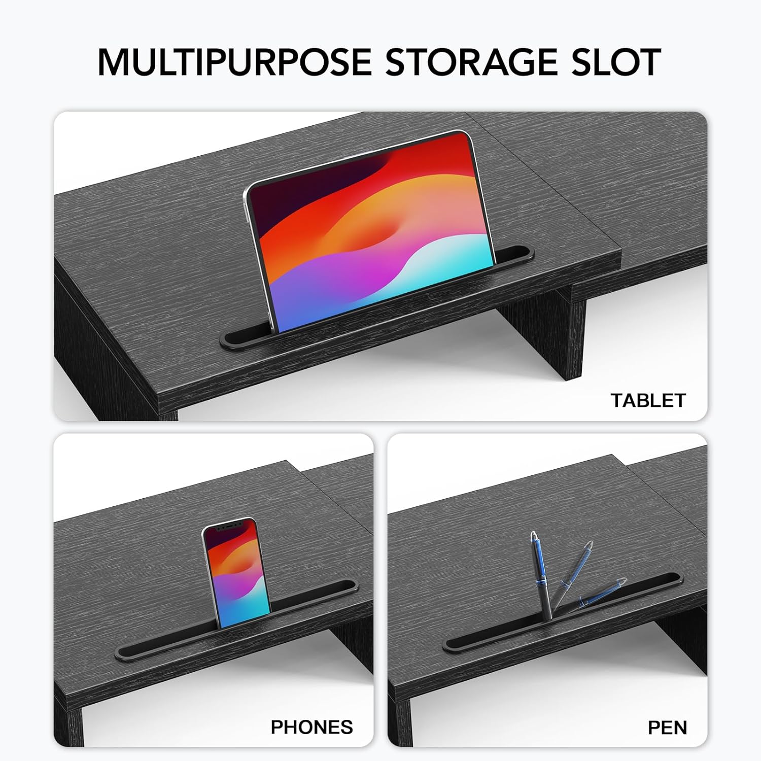 - Adjustable Length & Angle: The monitor stand riser features adjustable length from 29.13″ to 40.9″, allowing you to customize stand size to fit your setup. The adjustable monitor stand also has left and right platforms that can be swiveled inward to fit the right-angle shape of corner desks.