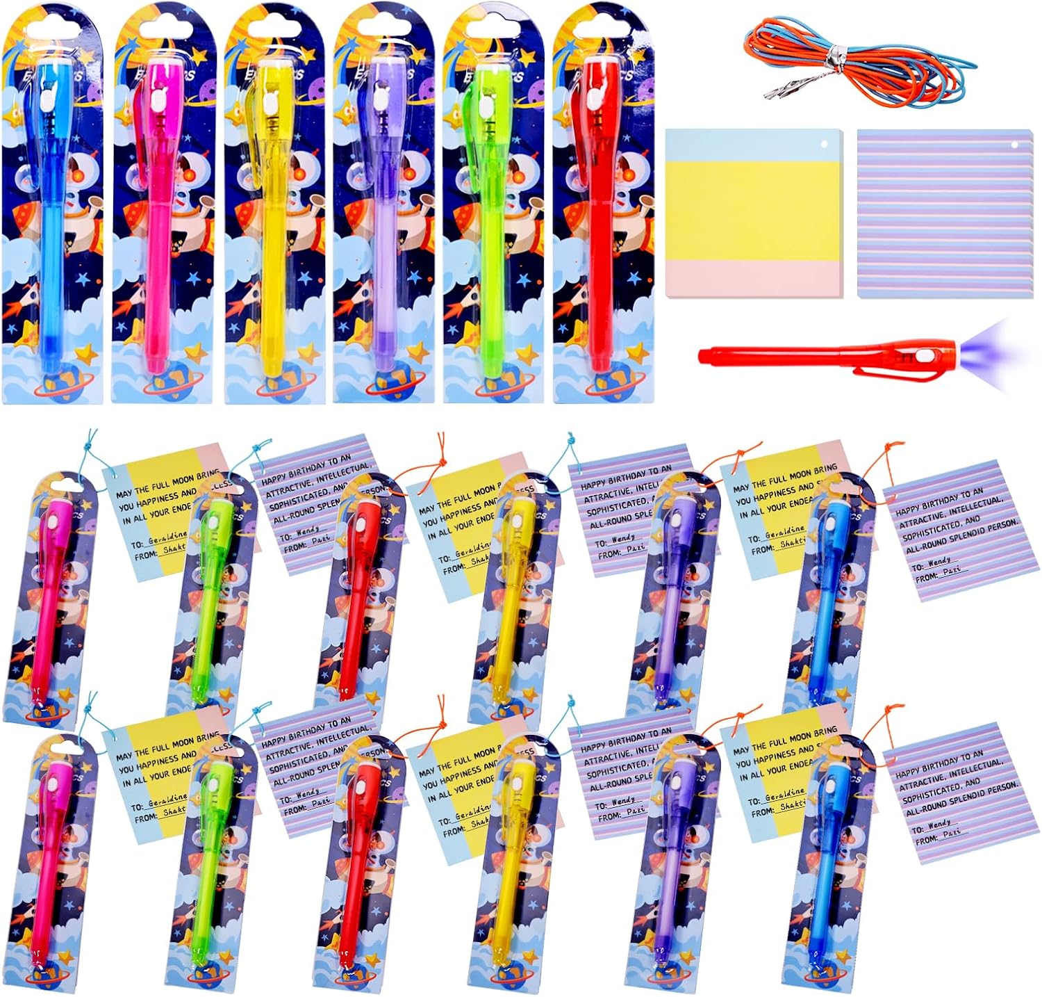 - Exquisite package: There is a magical star theme on the box which brings beauty and expectation. This top secret UV pen set includes 24 spy reusable invisible pens and 24 gifts cards. The invisible ink markers have 6 colors to choose from: blue, red, pink, yellow, green, and purple! All inks are invisible and UV LED lights are purple. The gifts cards are designed with colorful stripes, and they are perfect for writing secret blessings.