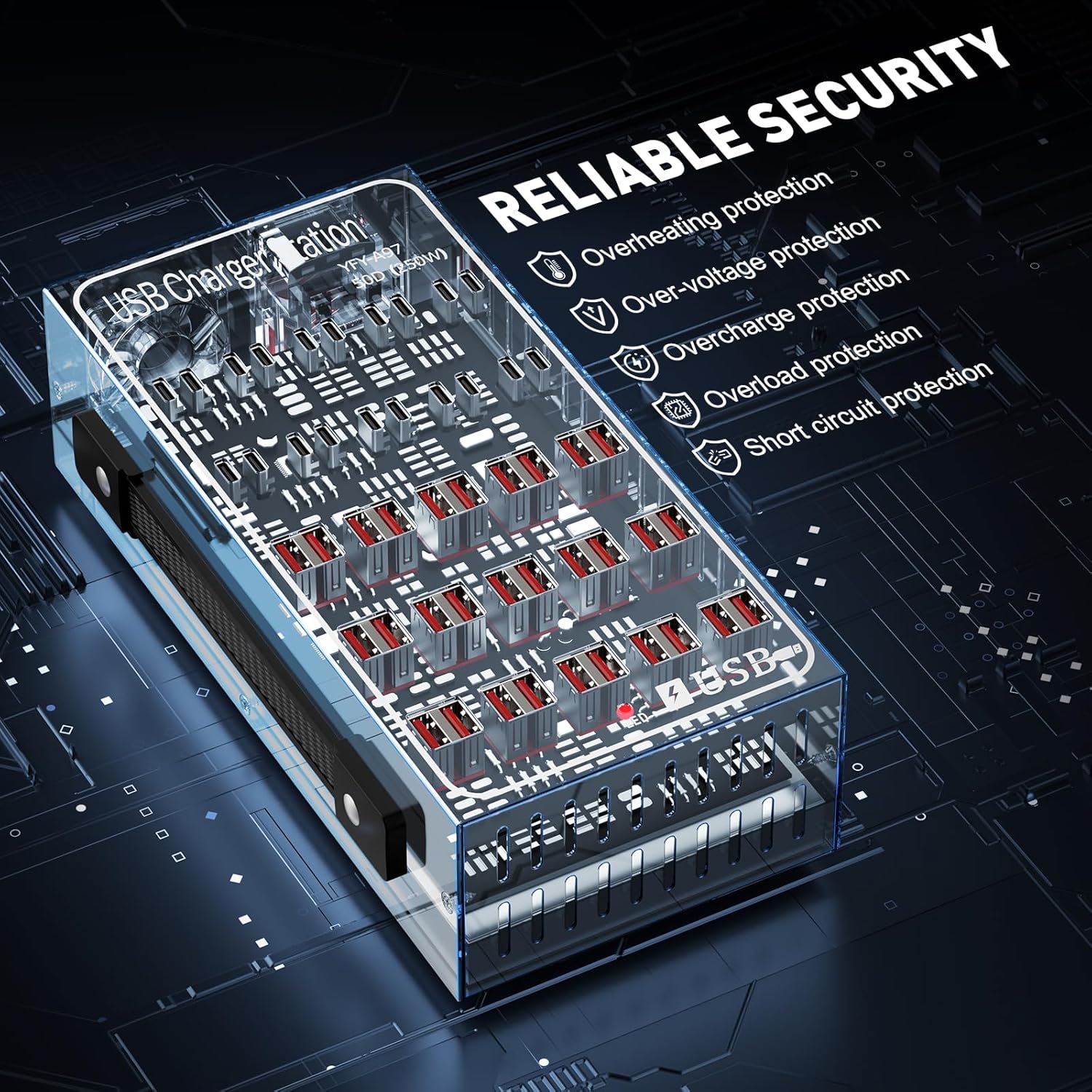 - [Safe and practical]: The 50 port charging station supports USB C port, USB A port output, and BC1.2. Although it has more power, this charger is designed with a multi-layered protection system to ensure your devices are protected from overheating, overcharging, and short circuits. Upgrade your charging experience to new levels of convenience and efficiency