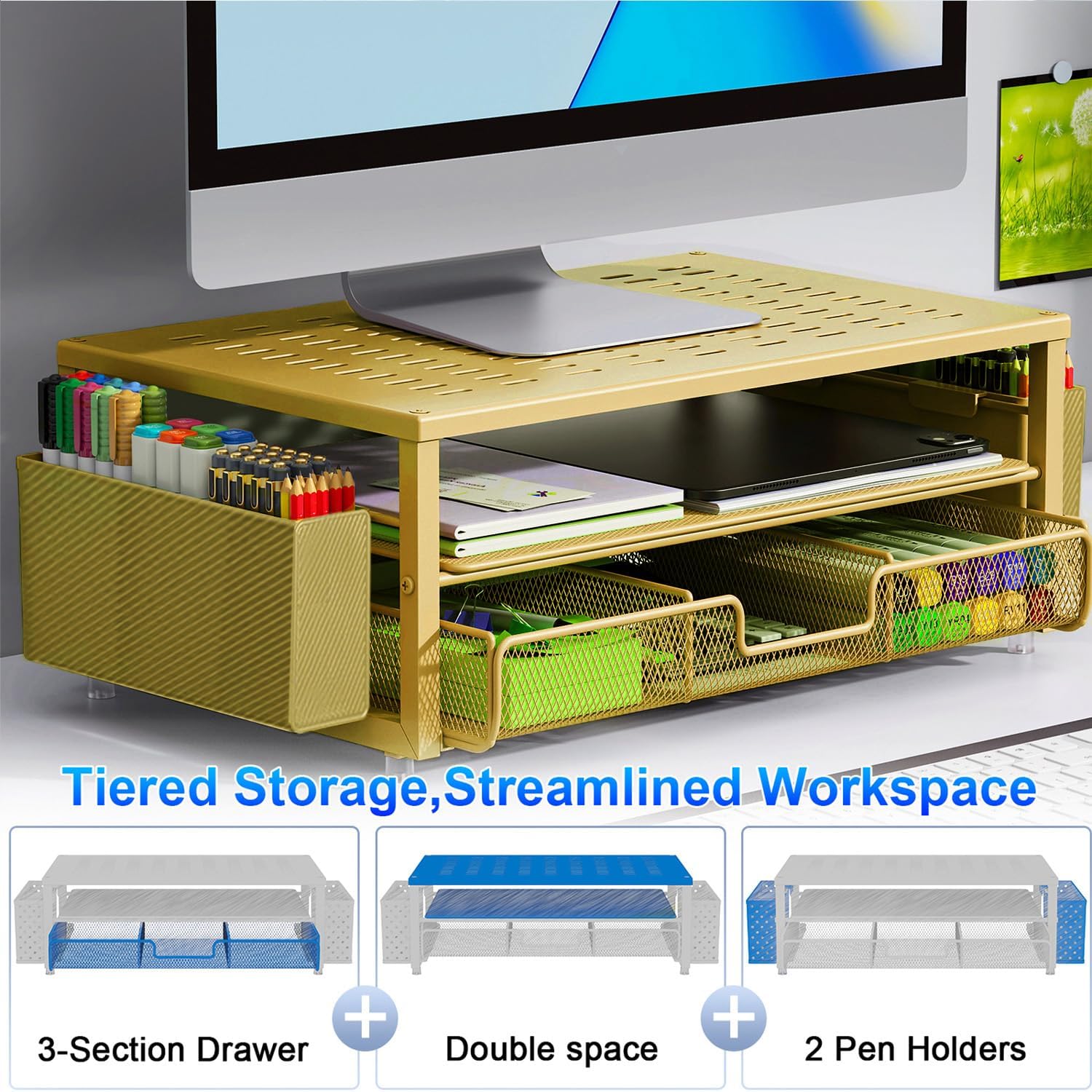 gianotter Desk Organizers and Accessories, Monitor Stand with Drawer and 2 Pen Holder, Desktop Organizer Suitable for Offices and Dormitories (Gold)