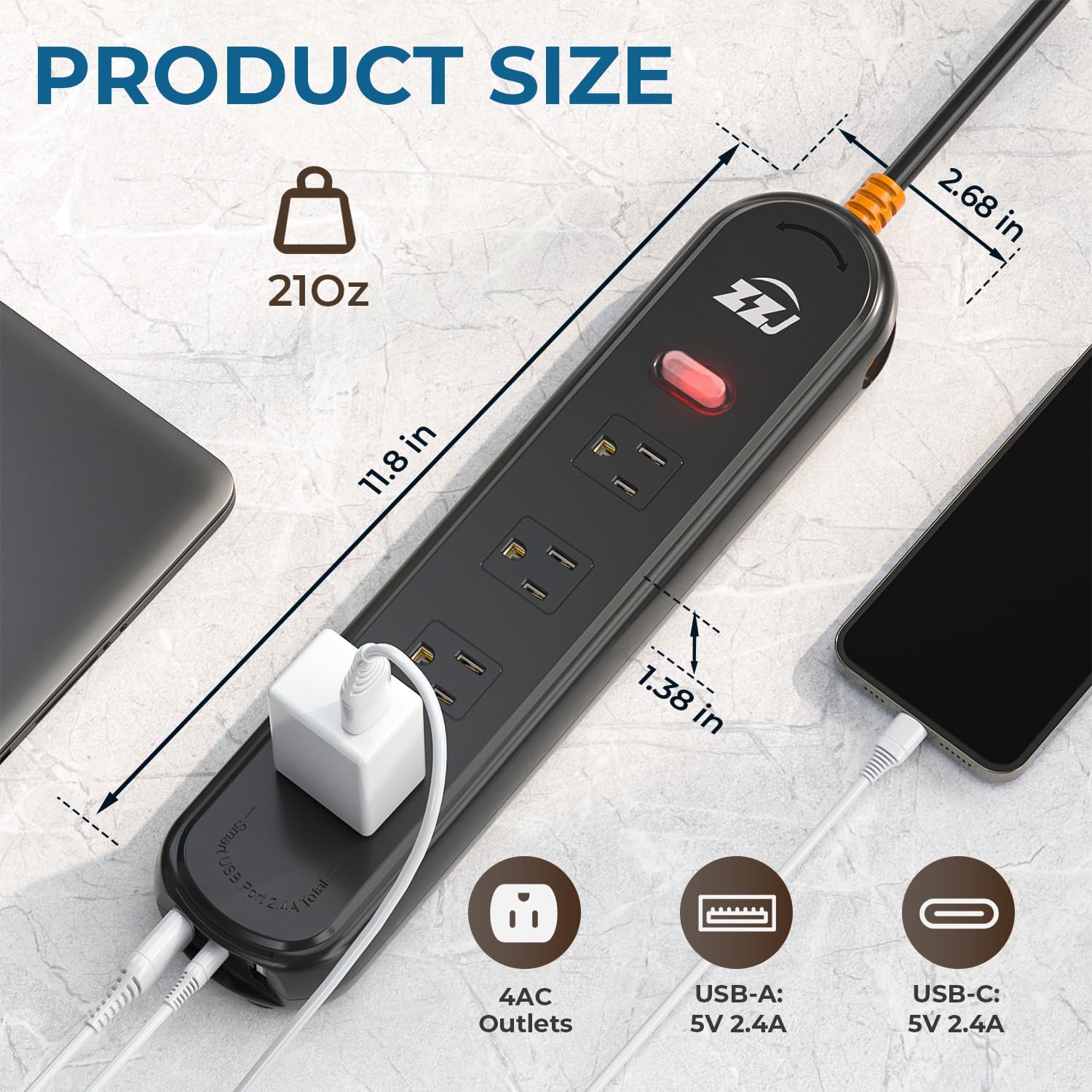 - 7-in-1 Power Strip :Features 4 AC outlets, 2 USB-C port, and 1 USB-A ports to give you everything you need to power up all of your appliances and mobile devices.USB-C: 5V 3.1A (15.5W max) USB-A: 5V 3.1A (2.4A max per port); 2 USB-A ports and 1 USB-C port share 5V 3.1A. product weight 808g