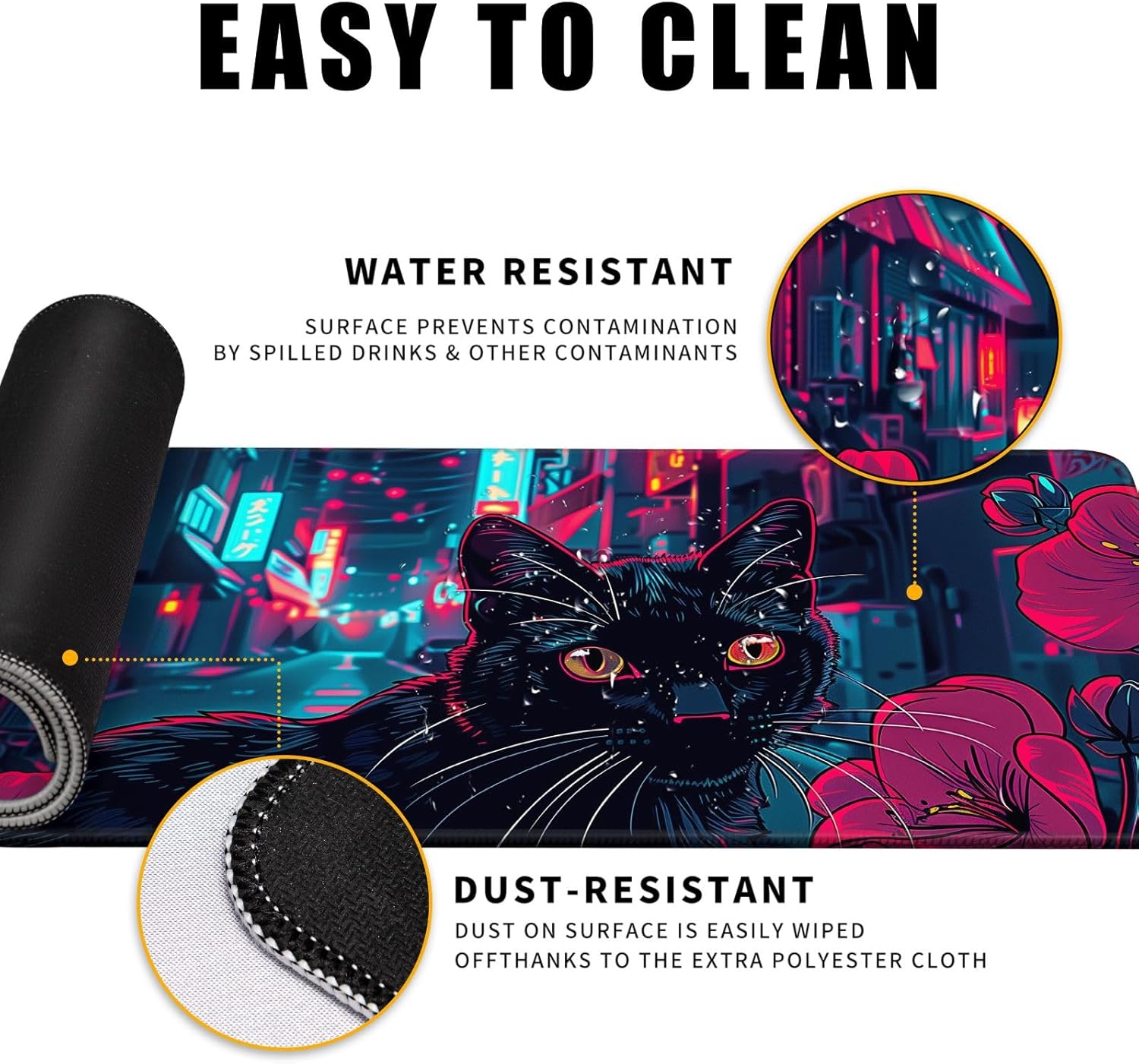 Japanese Black Cat Mouse Desk Pad Kawaii Red Anime Desk Mat Desk Decor Large Gaming Mouse Pad for Tokyo Neon Desk Mousepad Computer Office Keyboard Laptop Big Floral Mouse Pad Xl-31.5x11.8 in